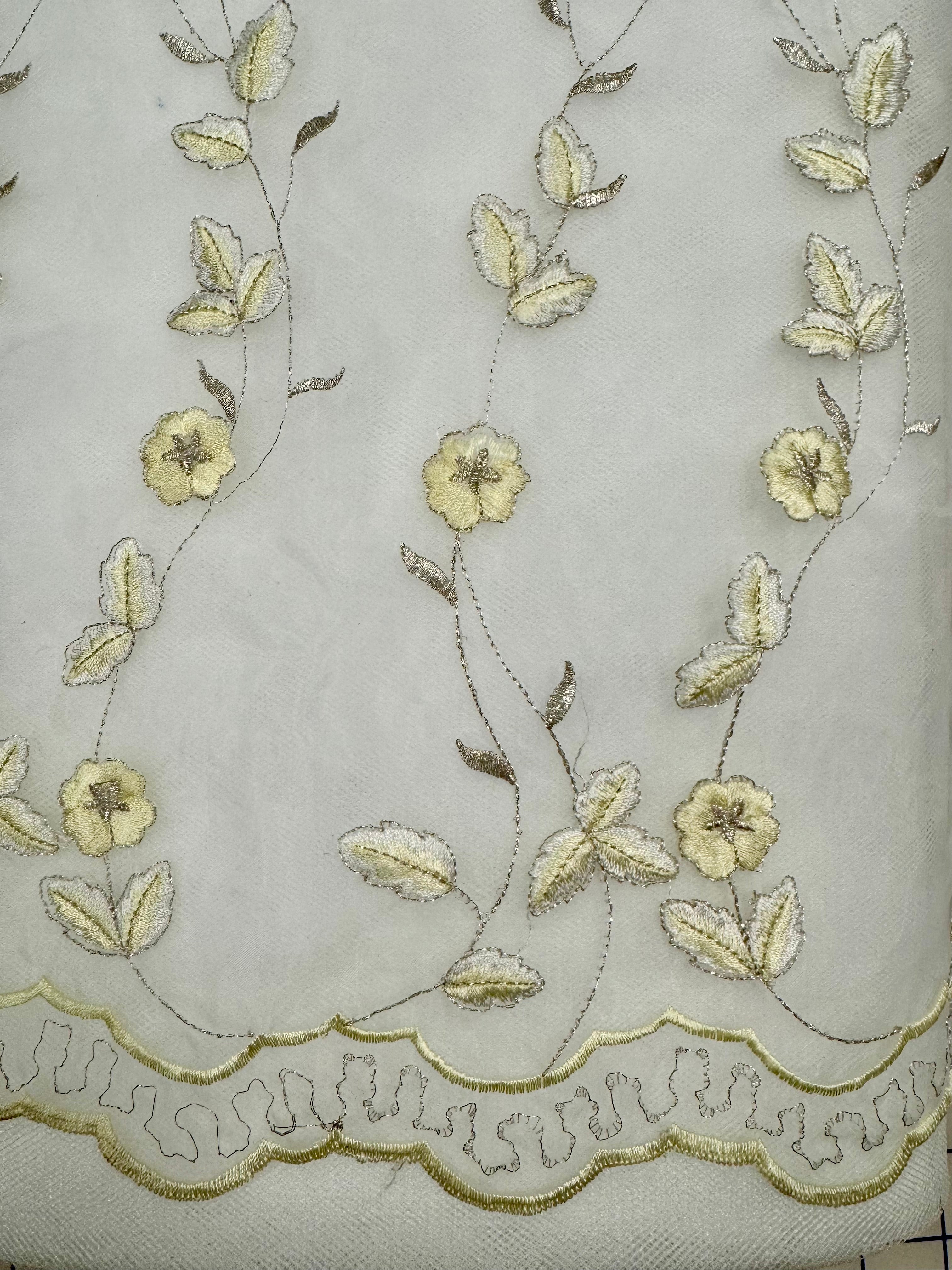 Priced per 2-yard piece. White organza with yellow embroidered flowers and double border. 40-inches wide.