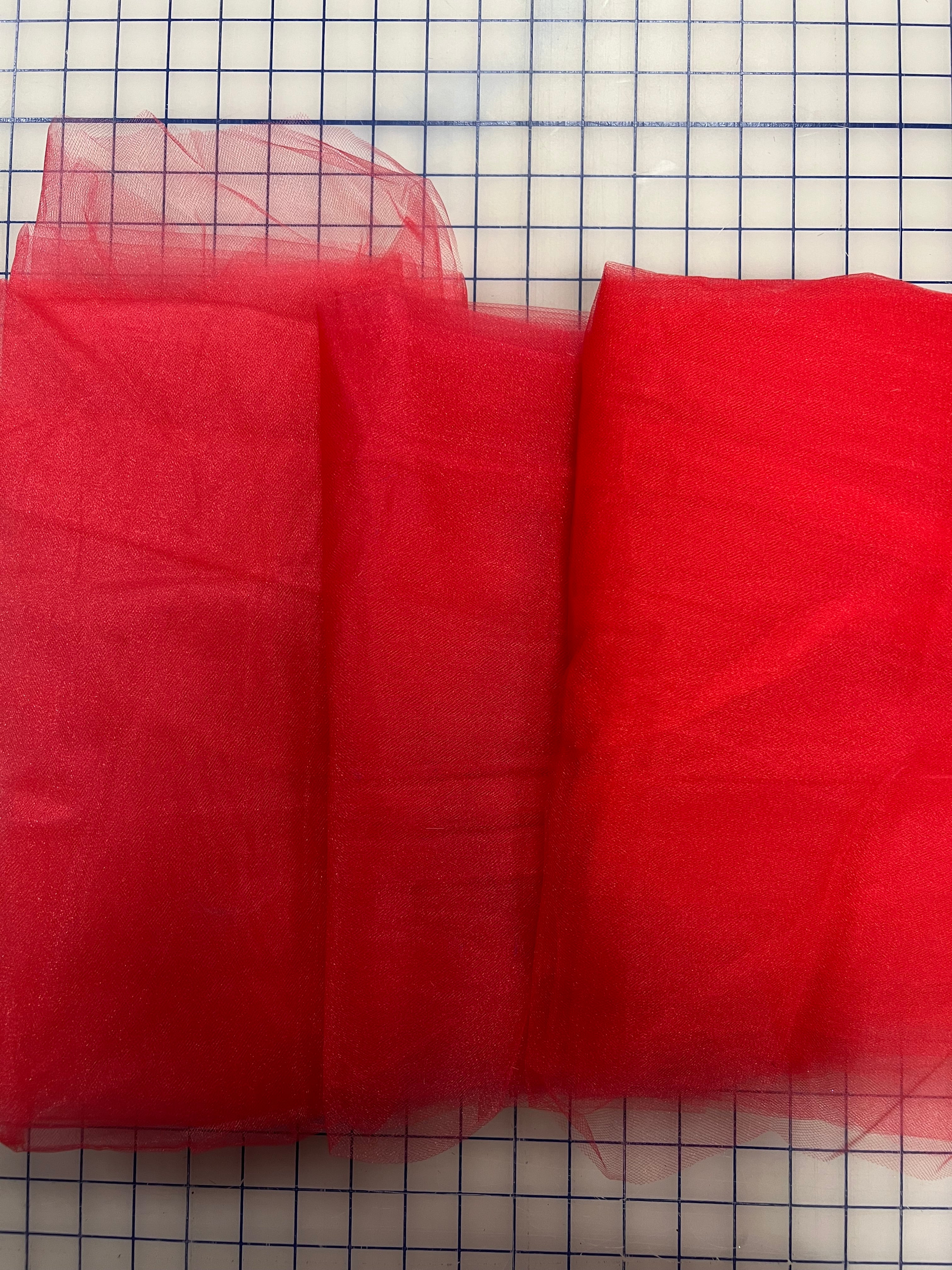 Priced per grab bag. Glimmer tulle +/- 7 yards total. Shades of red.