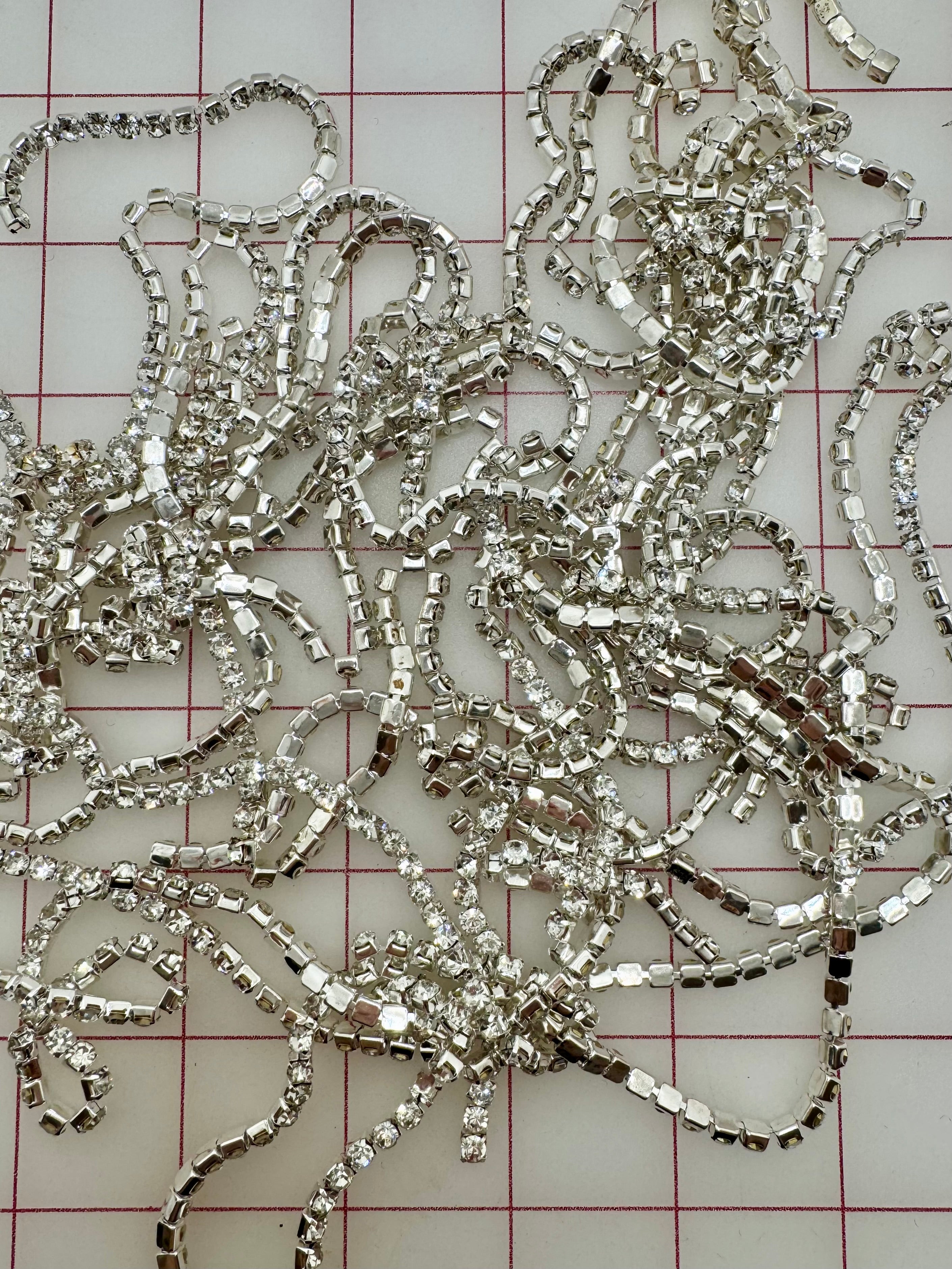 Priced per grab bag. Pieces are from 30-inches to 40-inches long. Crystal/Silver cup chain 18ss rhinestones.