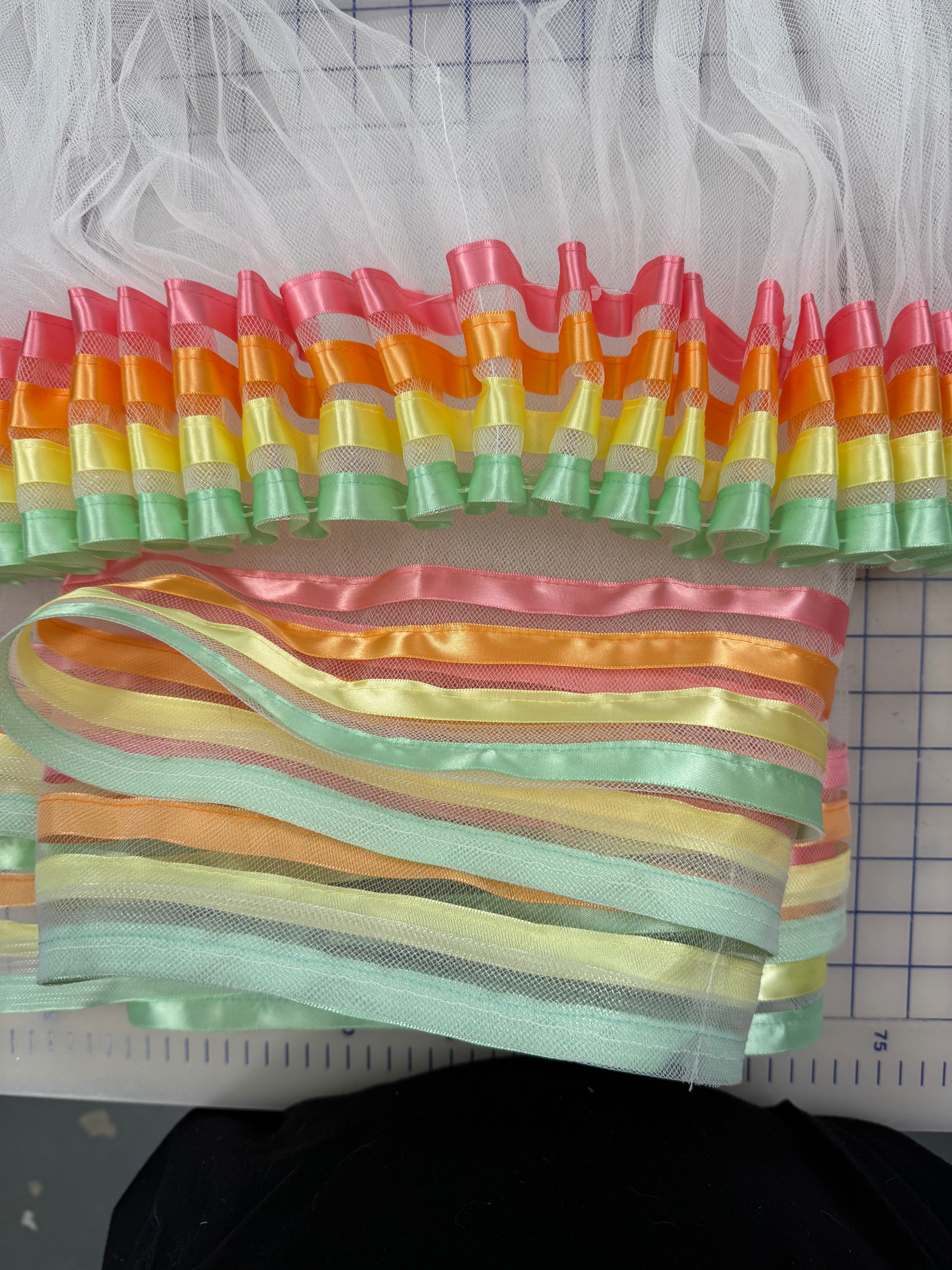 Priced per grab bag. White net with yellow, green, pink, and peach ribbons sewn on.One piece has been finished into "ribbon candy" and gathered. Absolutely stunning!