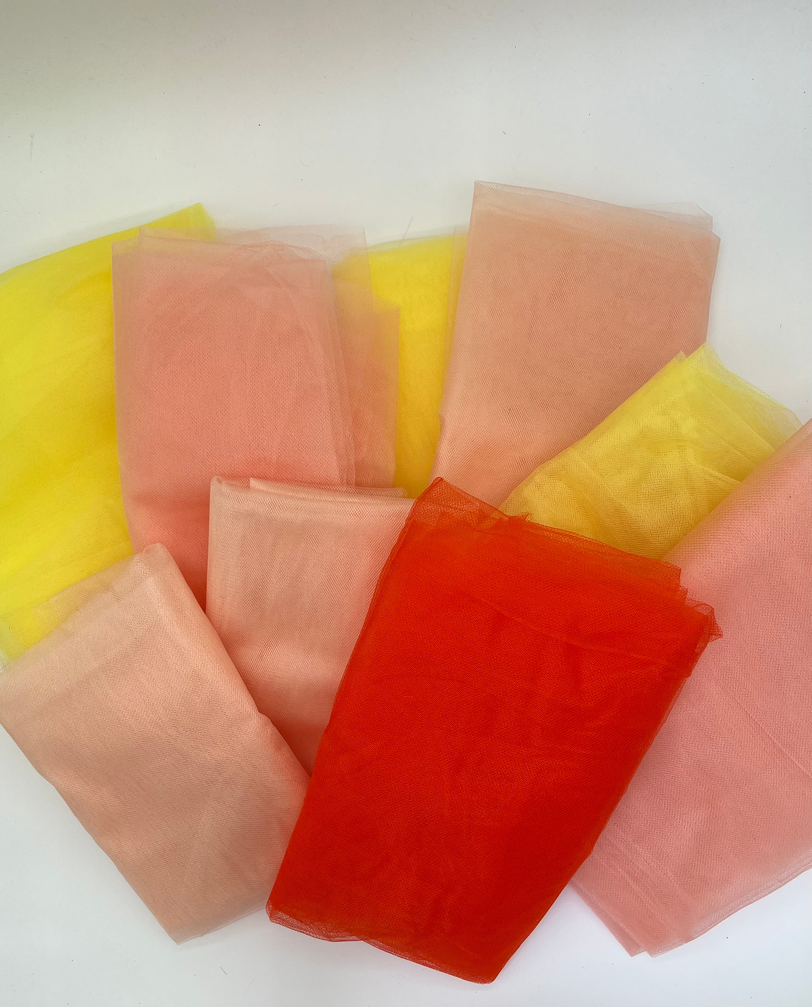 Priced per grab bag. +/- 10 yards. Shades of yellow, orange, and peach tutu net.