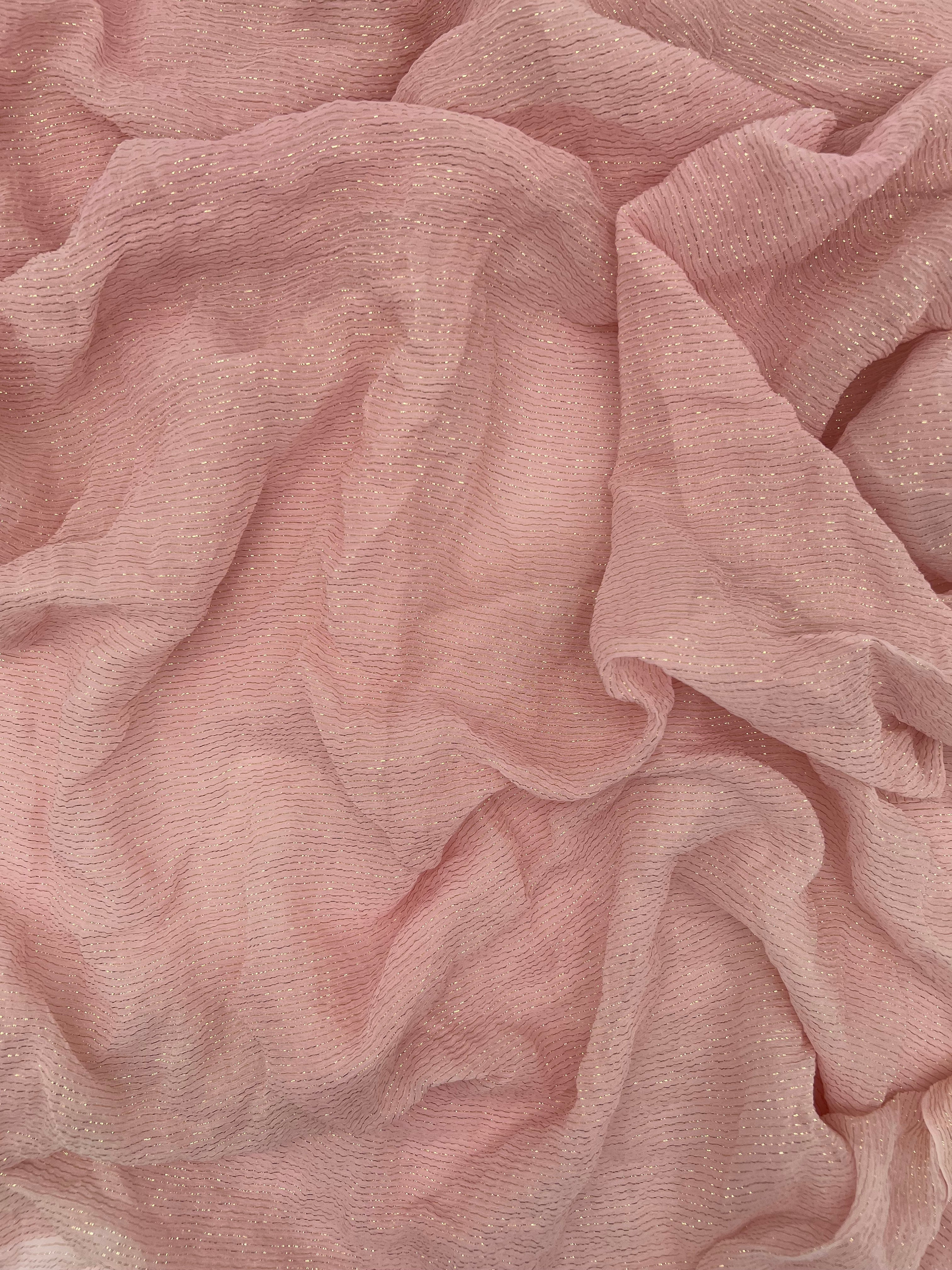Priced per 2-yard grab bag. Custom-dyed, pink with metallic gold reflex stripe silk chiffon.