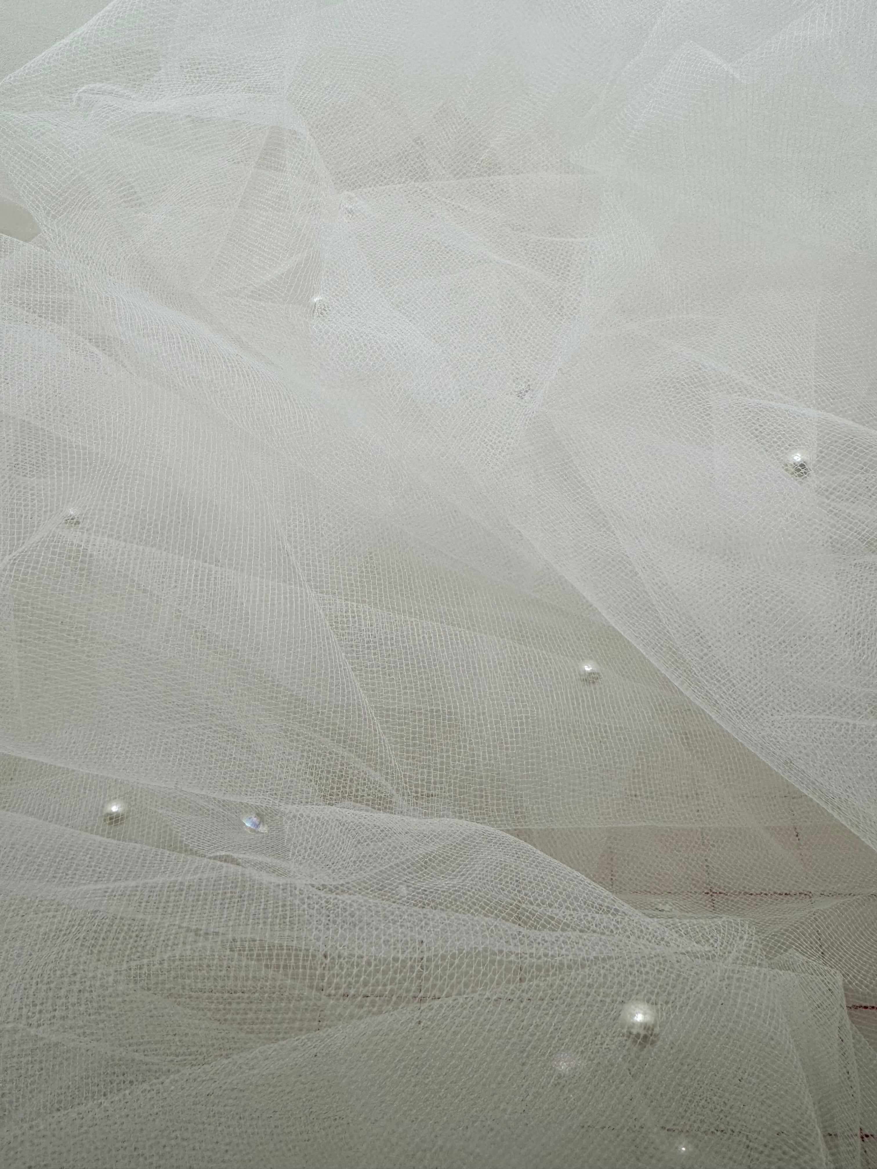 Priced per grab bag. Soft cream white silk tulle with pearls. 10-20 inches wide, 5.5 yards long.