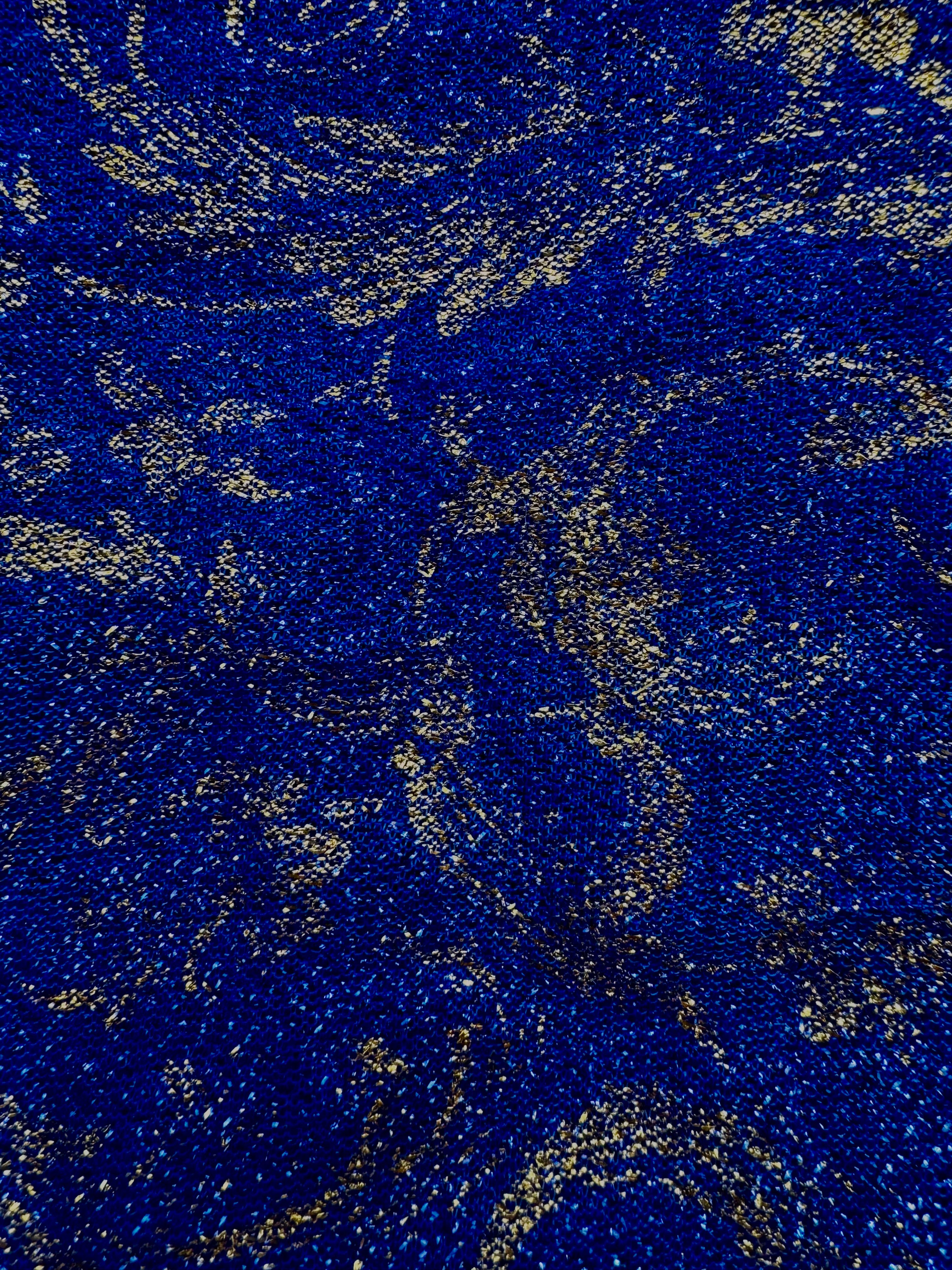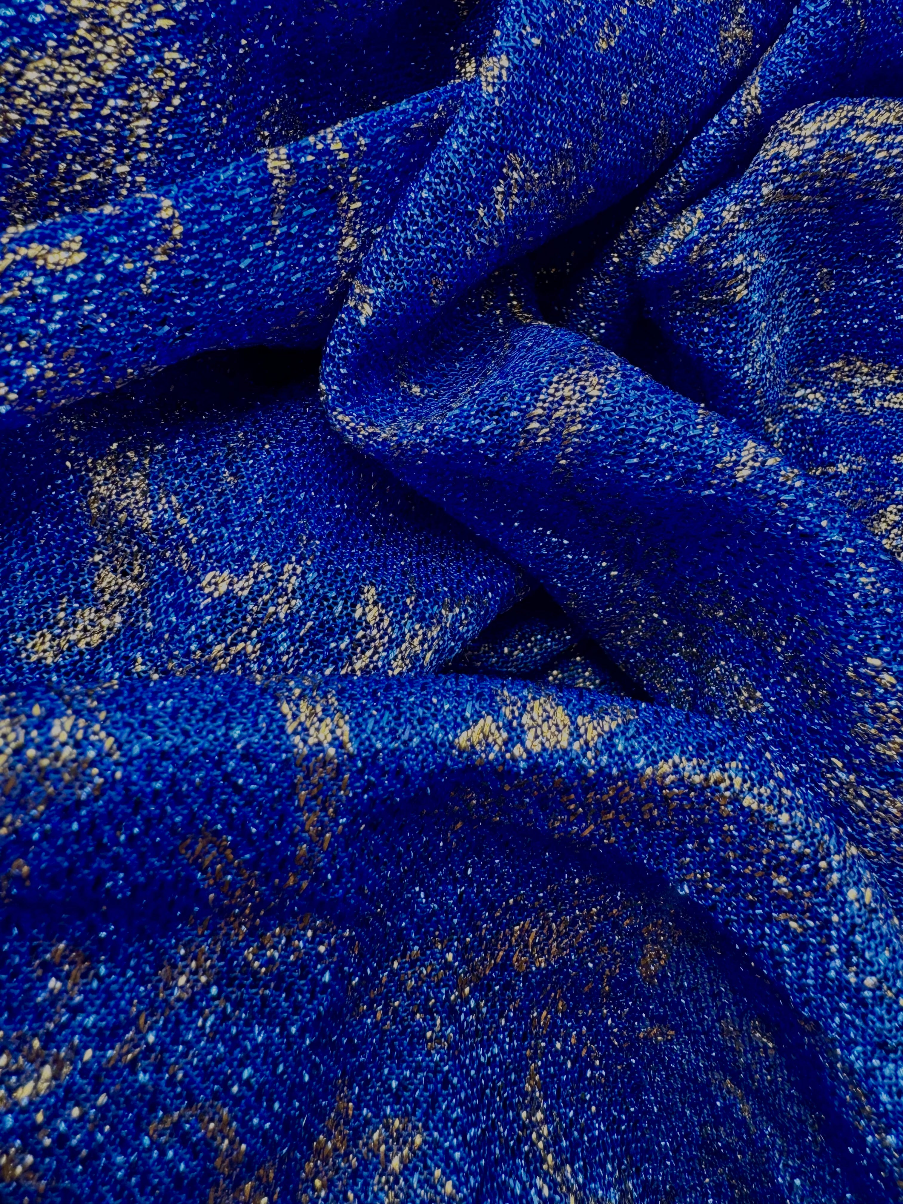 Priced per 2-yard piece. Gorgeous, Royal blue and metallic gold stretch crepe mesh. 46-inches wide.