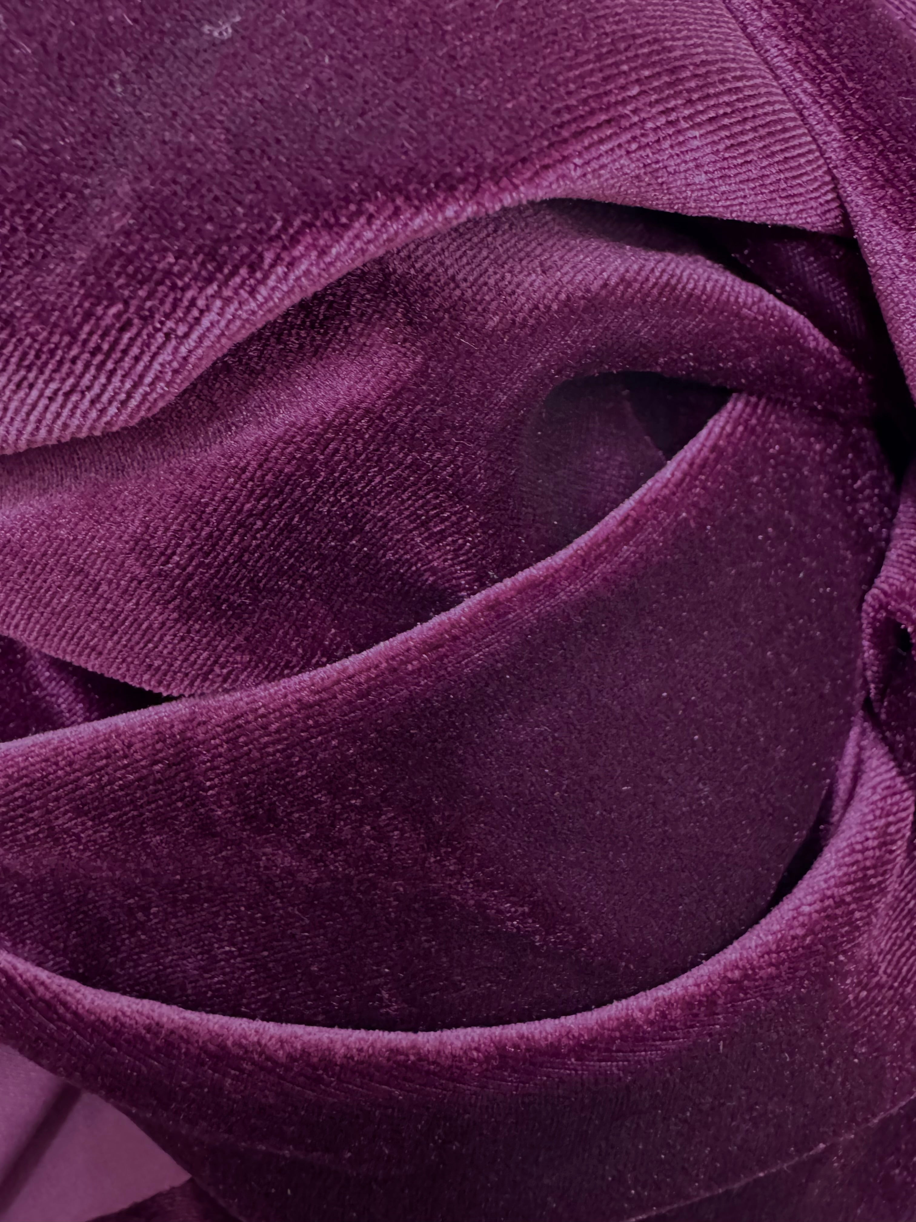 Priced per .75-yard piece. Wine stretch velvet 60-inches wide. Beautiful saturated color!