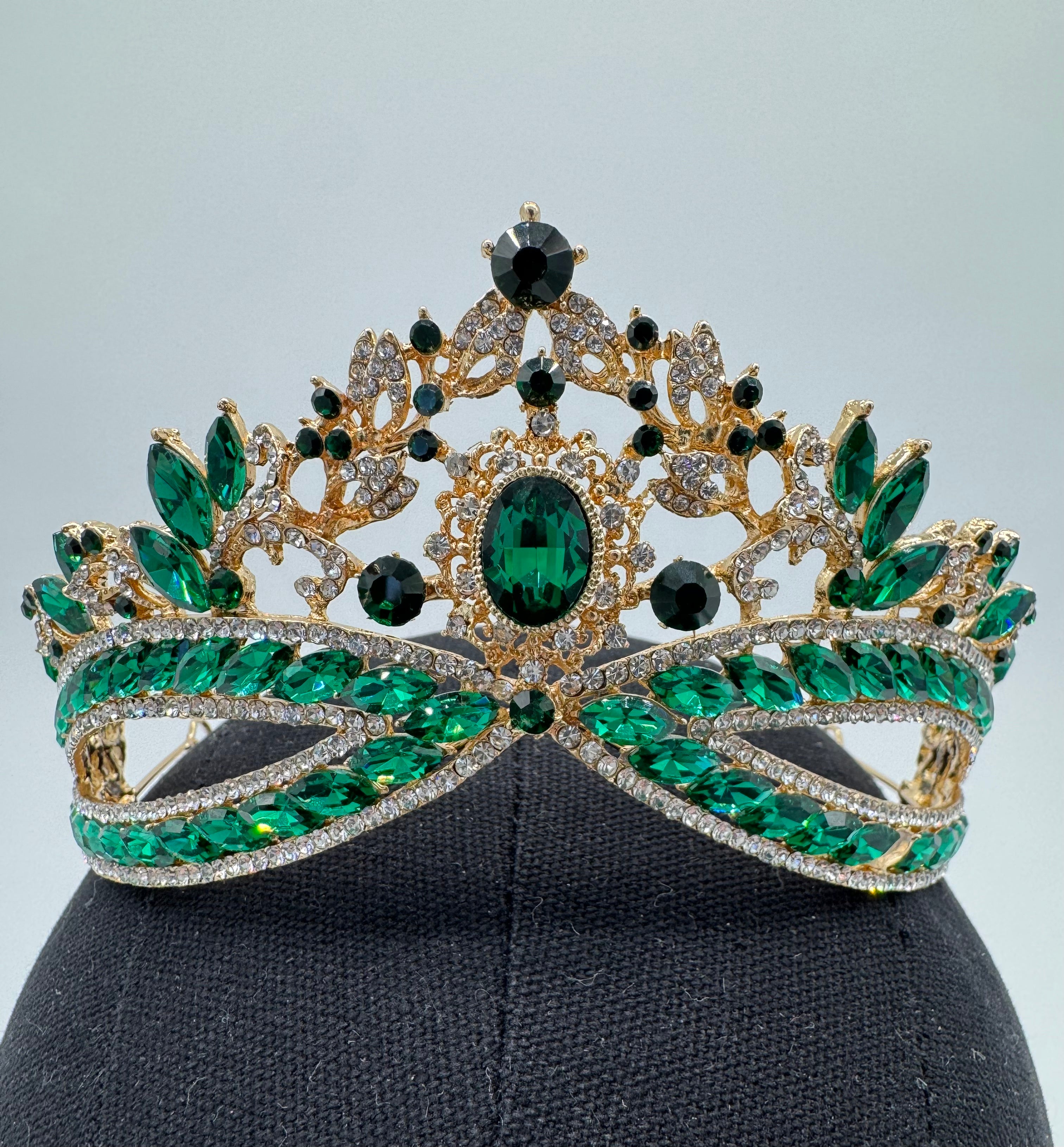 Priced per piece. Beautiful gold and emerald royal-style tiara - discounted because it is missing one emerald stone. Perfect for many ballet roles. This tiara can also be worn "upside-down" for a totally different look.