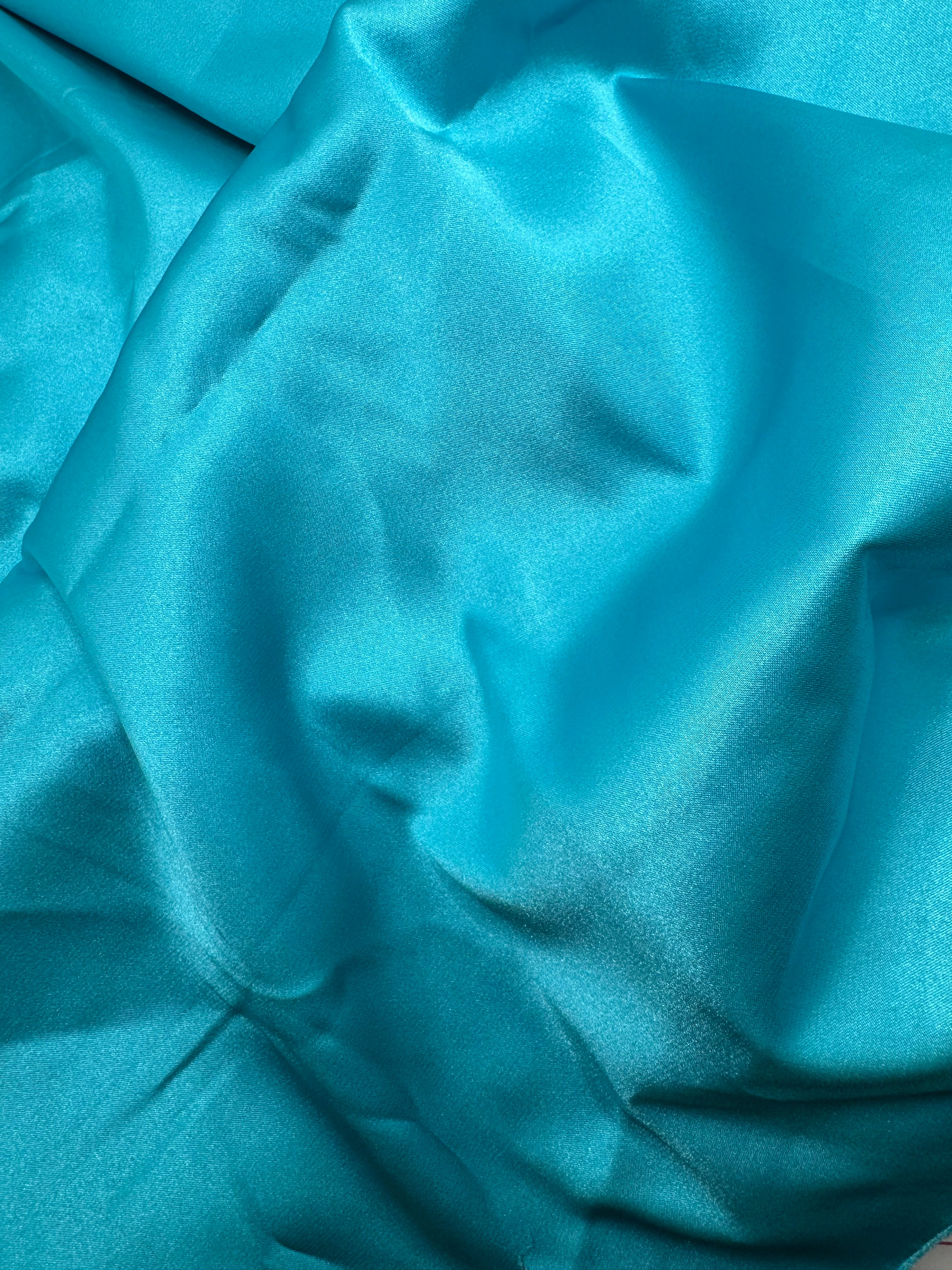 Priced per 1/2 yard grab bag. Turquoise stretch satin, 50-inches wide.