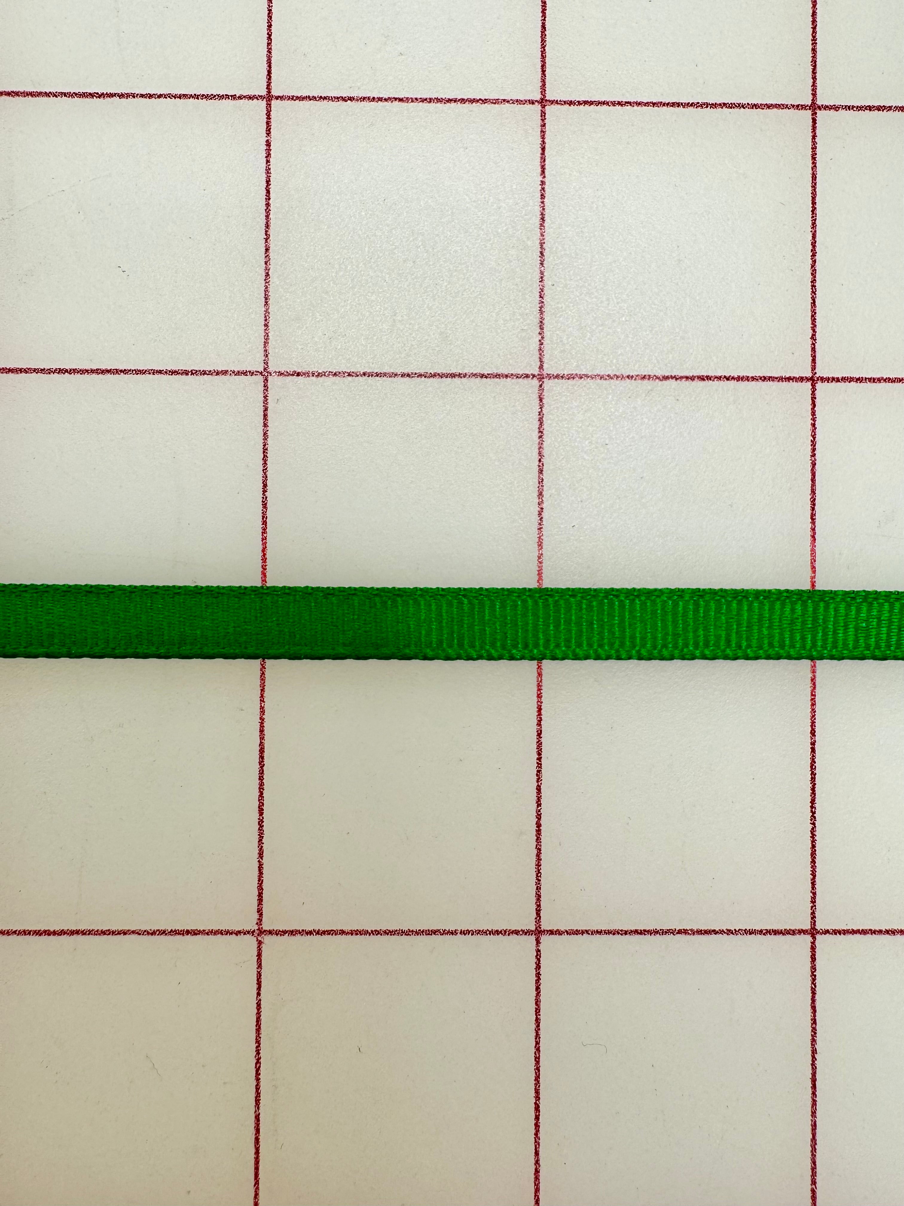 Priced per yard. Kelly Green 1/4-inch grosgrain ribbon. Perfect for center front ribbons on a Peasant-style ballet bodice!