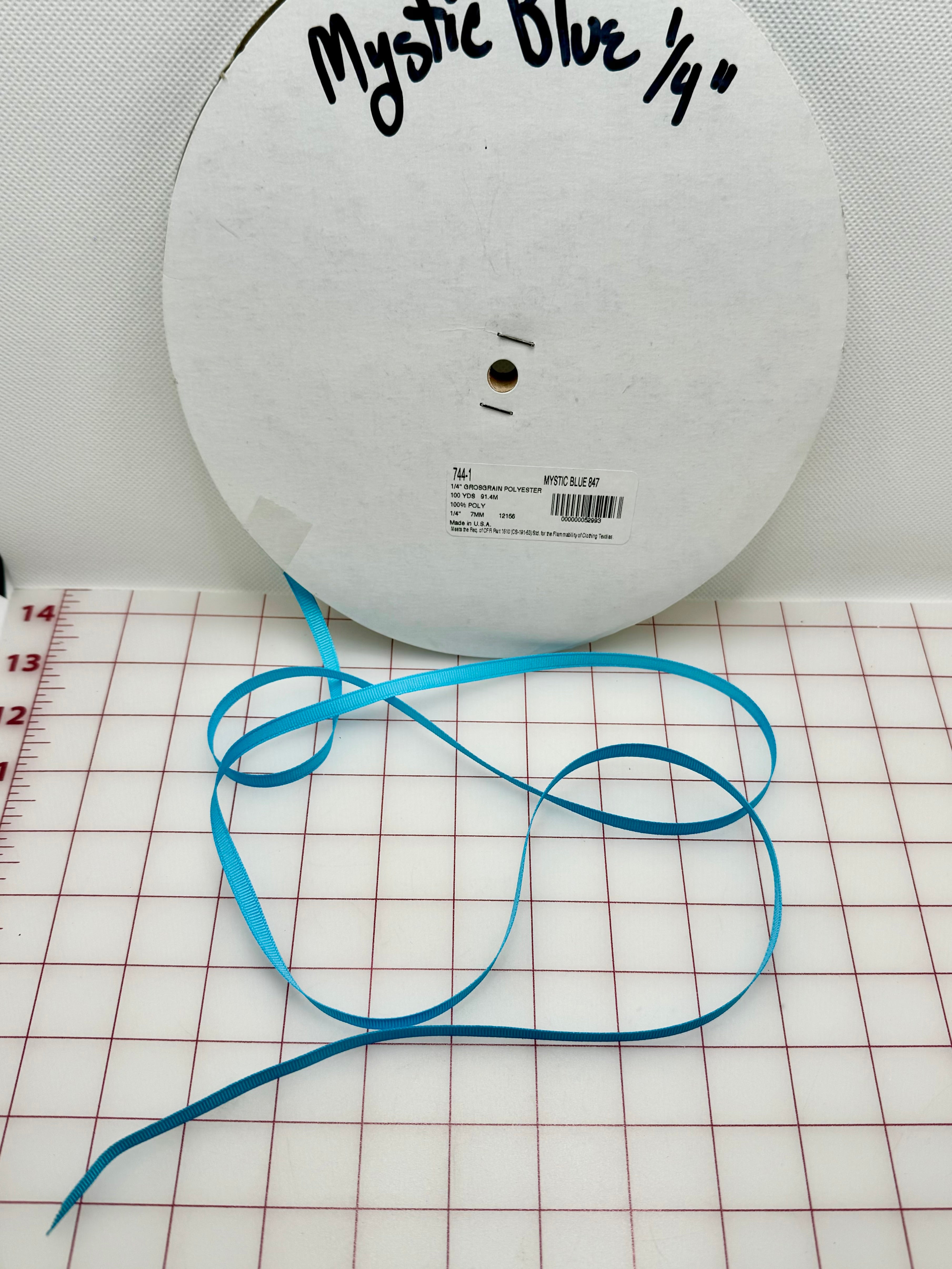 Priced per yard. Mystic Blue (Turquoise), 1/4-inch grosgrain ribbon.