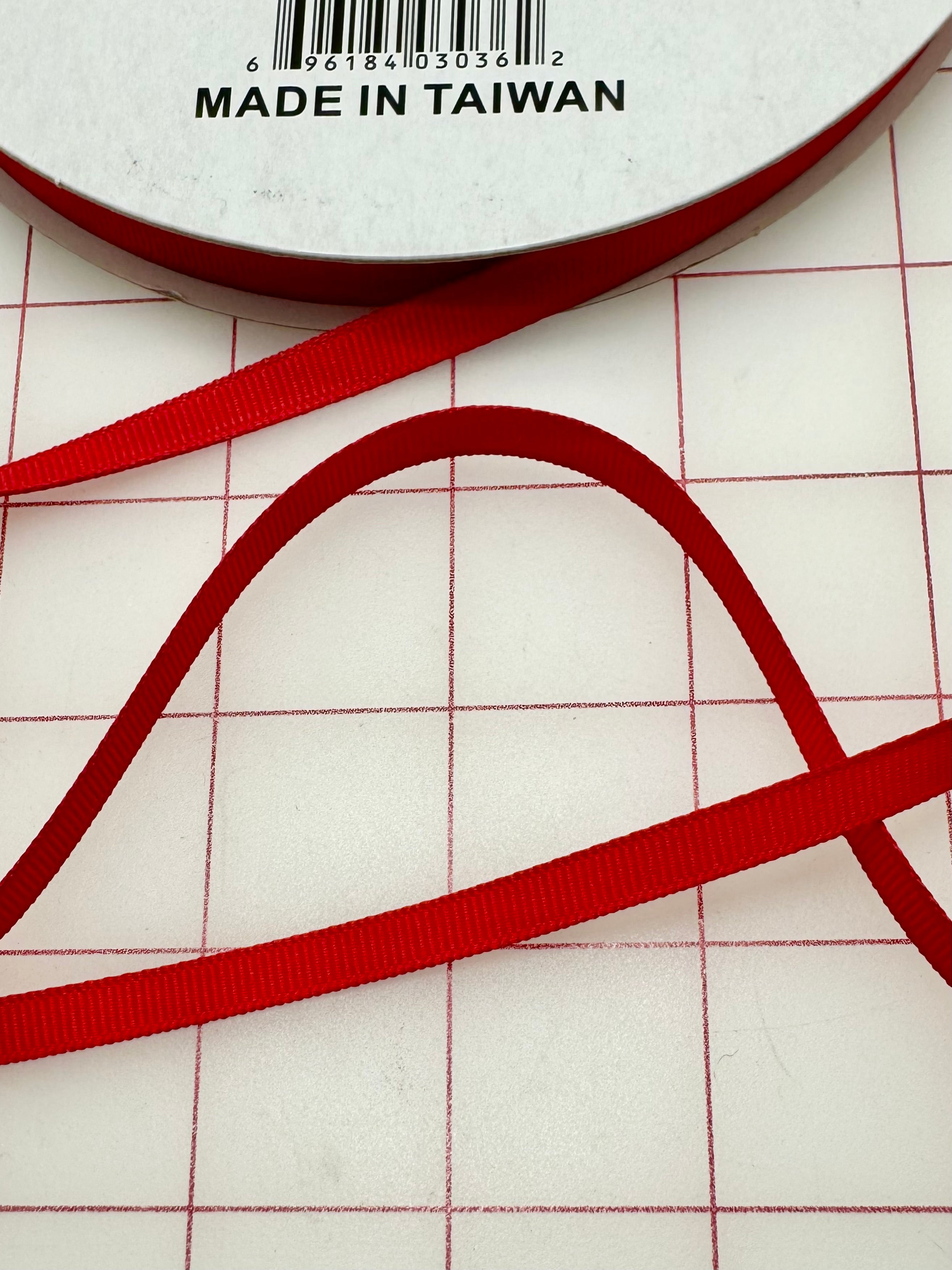 Priced per yard. Red 1/4-inch grosgrain ribbon. 20% discount on 100-yard rolls.