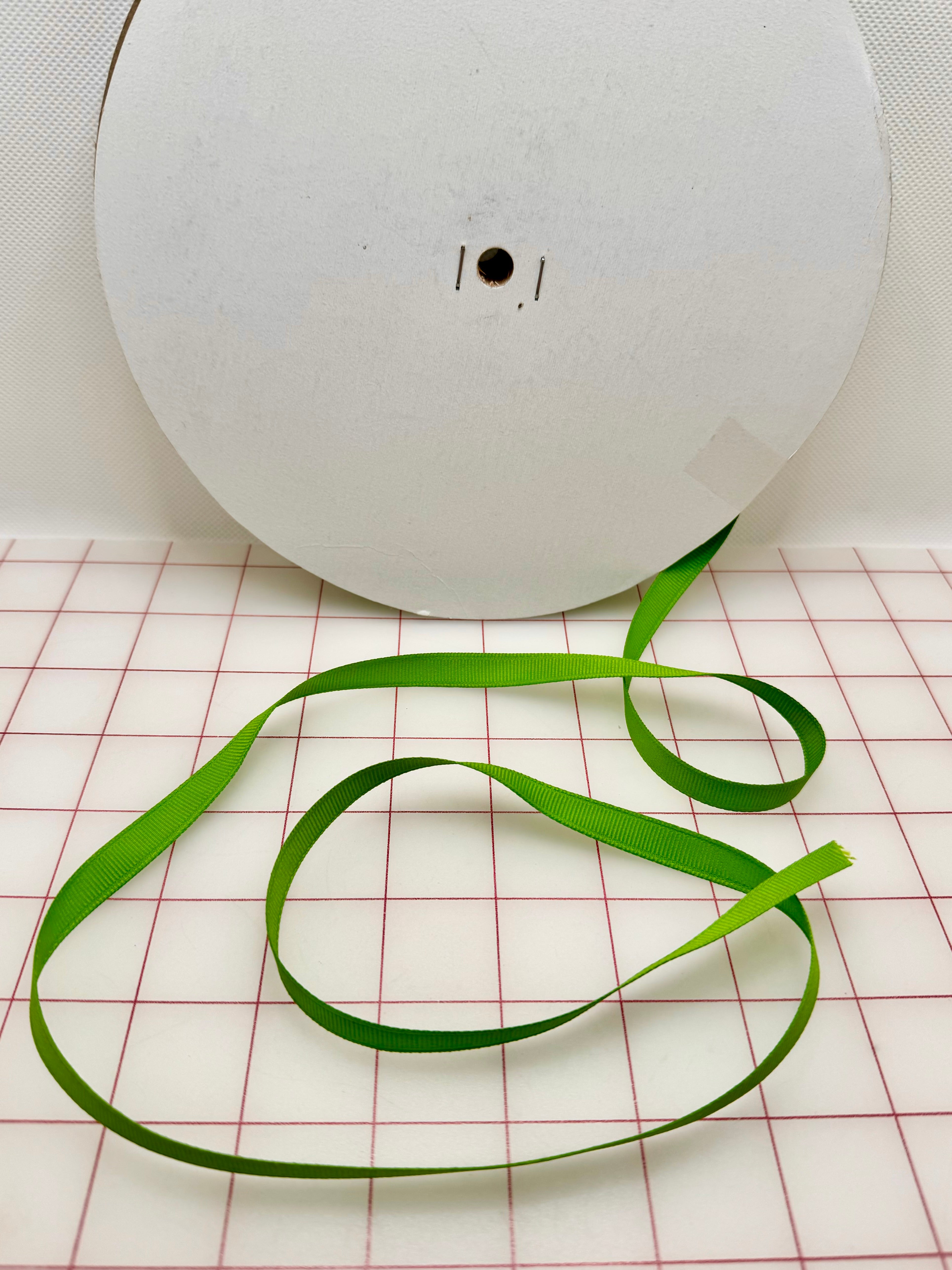 Priced per yard. Apple Green, 3/8-inch grosgrain ribbon. Perfect for the center front ribbon detail on Peasant-style ballet bodices.