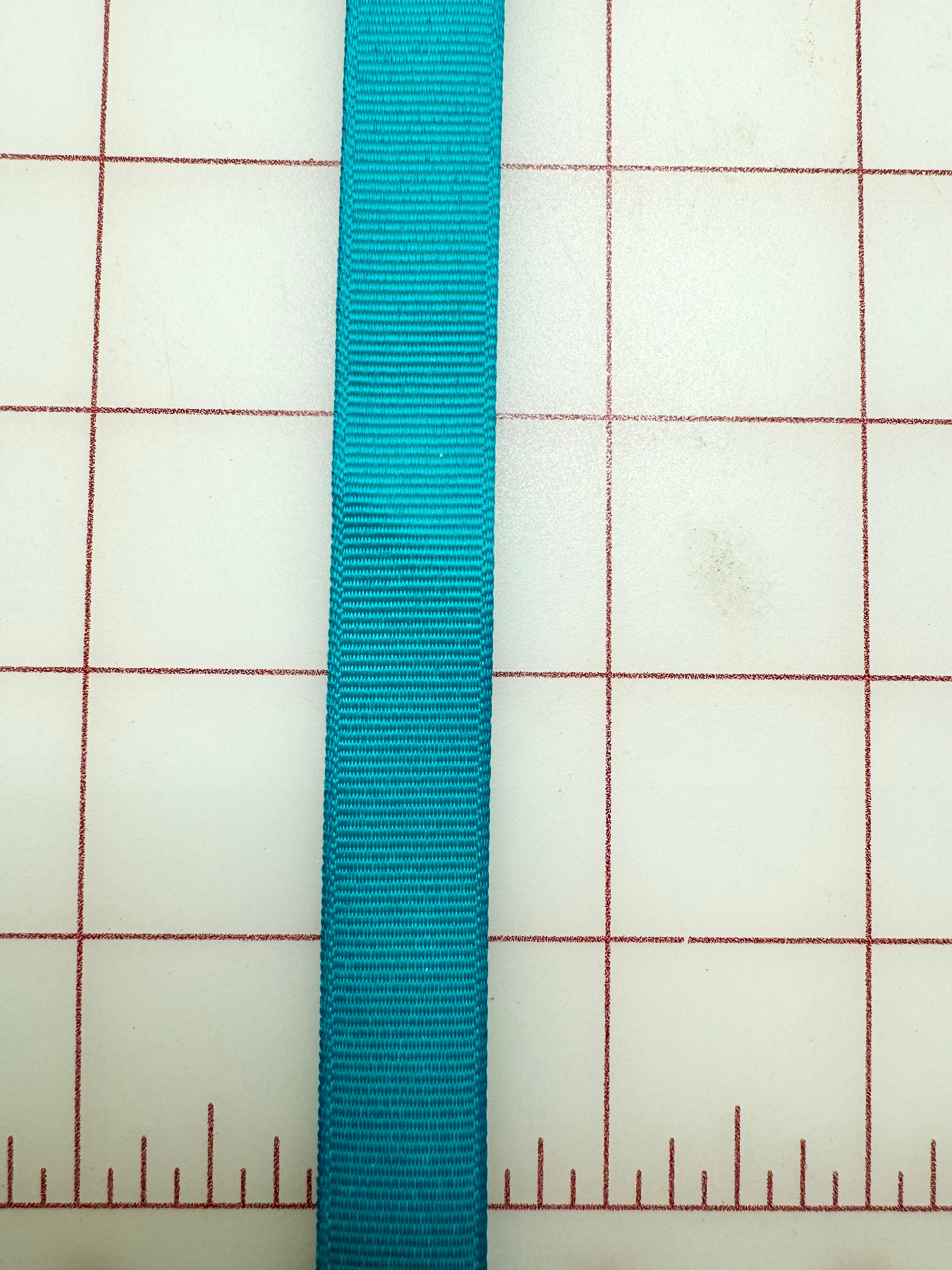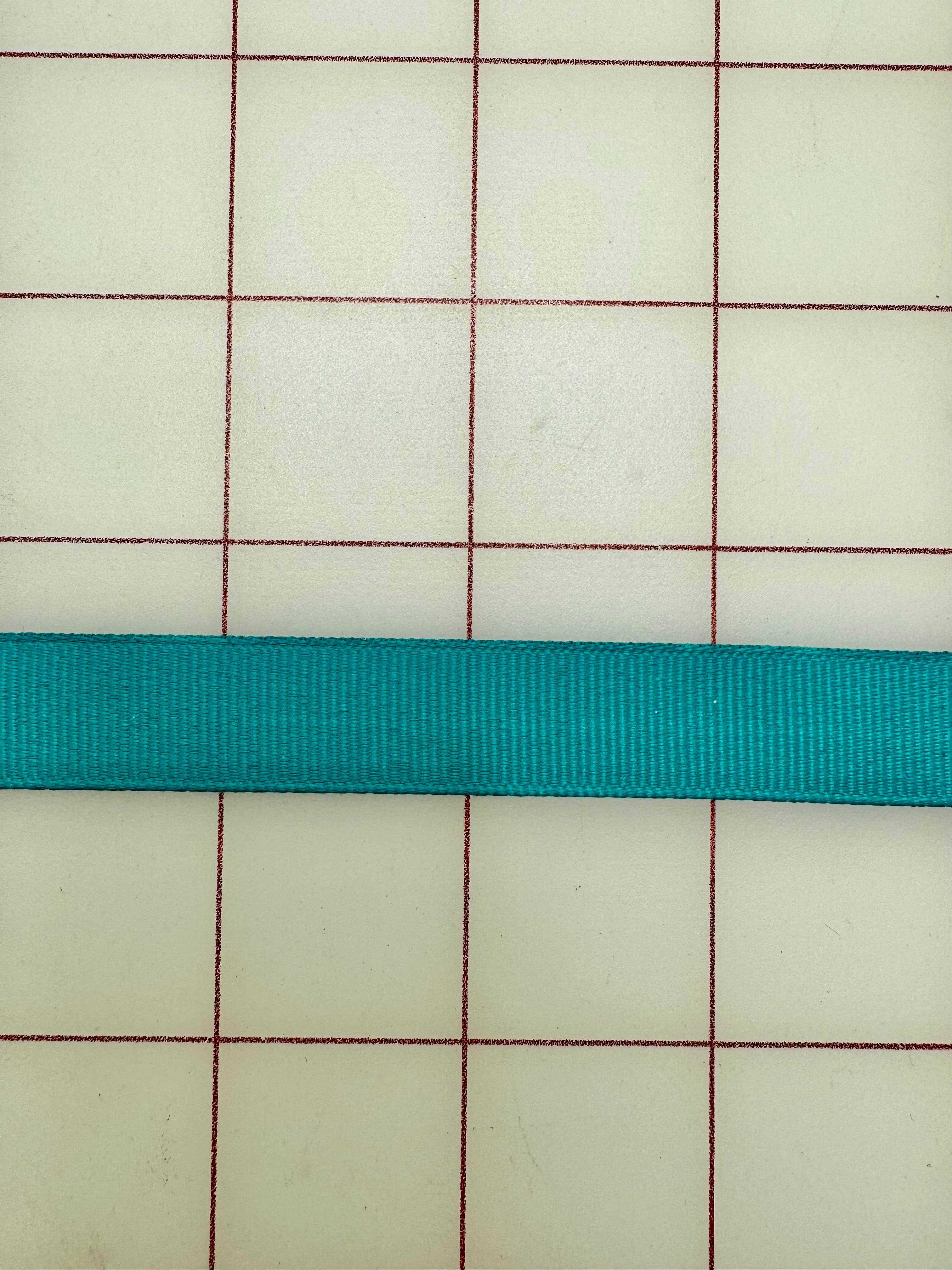 Priced per yard. Teal 5/8-inch grosgrain ribbon. 20% discount per 50-yard roll.