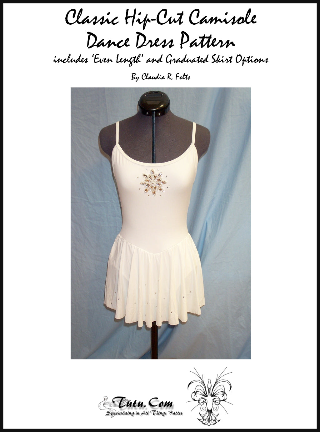 This leotard dress is perfect for spandex, with chiffon, glissenet, stretch mesh or double georgette for the skirt. The medium-low, softly rounded back accentuates the dancer's beautiful upper-back and shoulders. The hip-cut skirt drapes perfectly for a very flattering line. The pattern features two skirt designs: cut short and even (as shown), or graduated to two inches longer in the back (cascade). Multi-size. Instructions included.