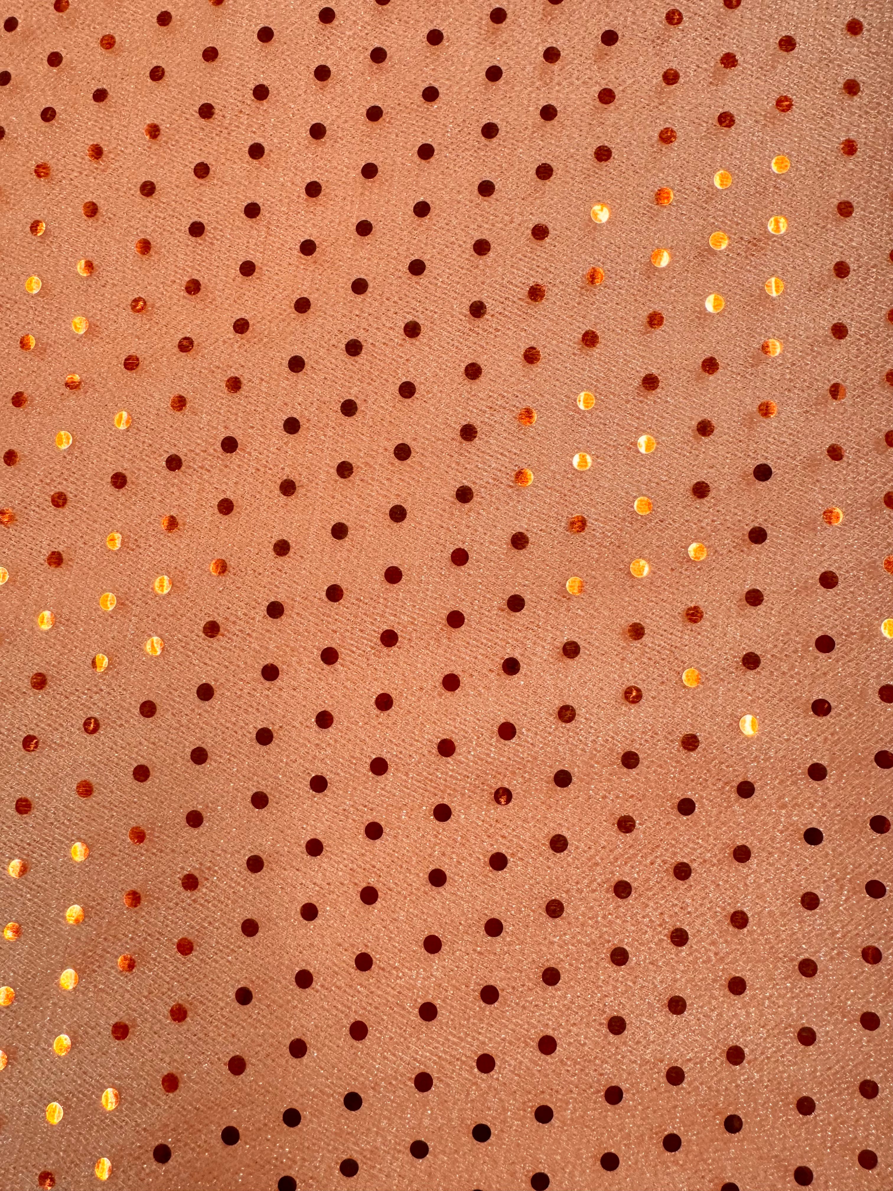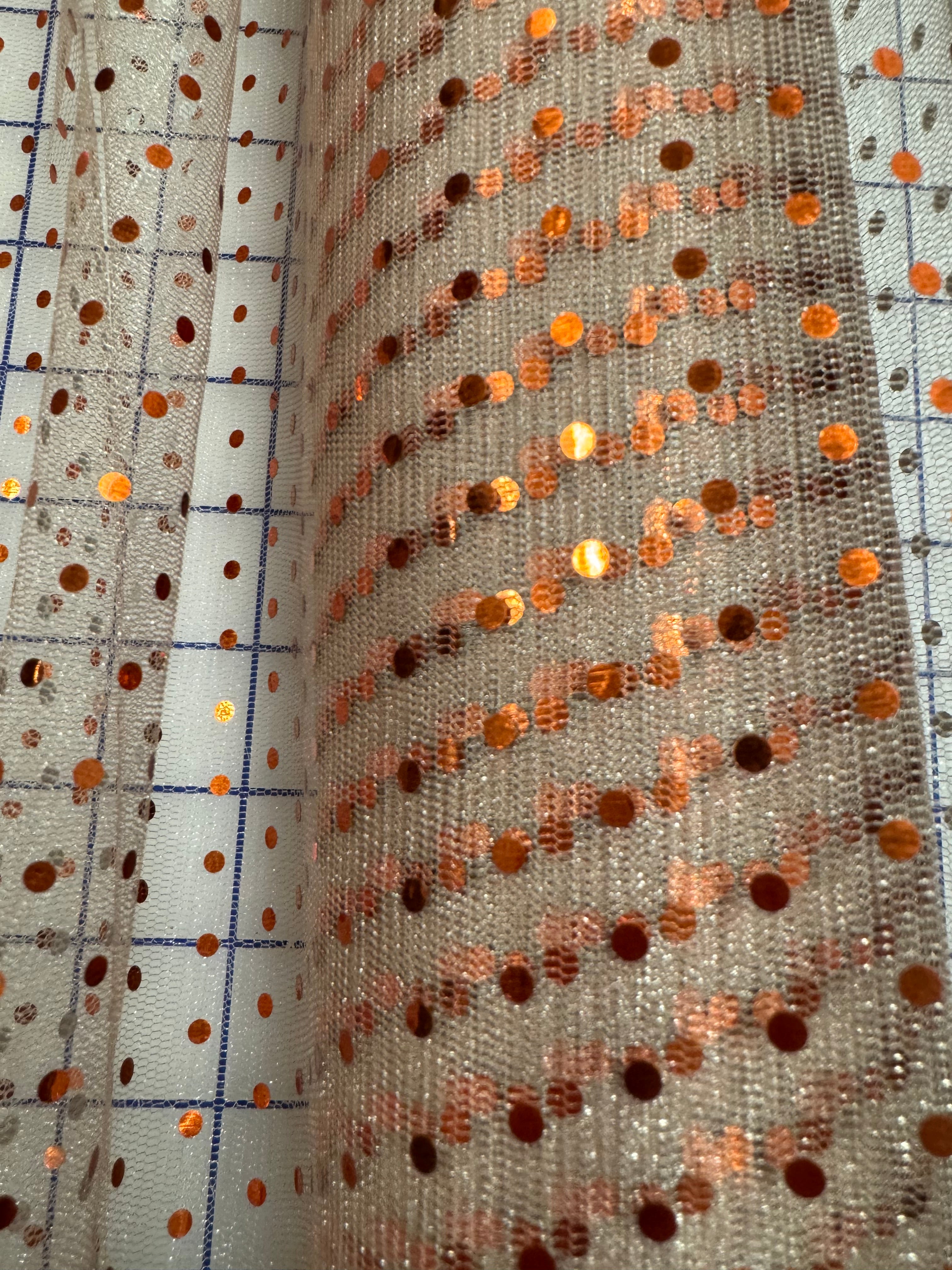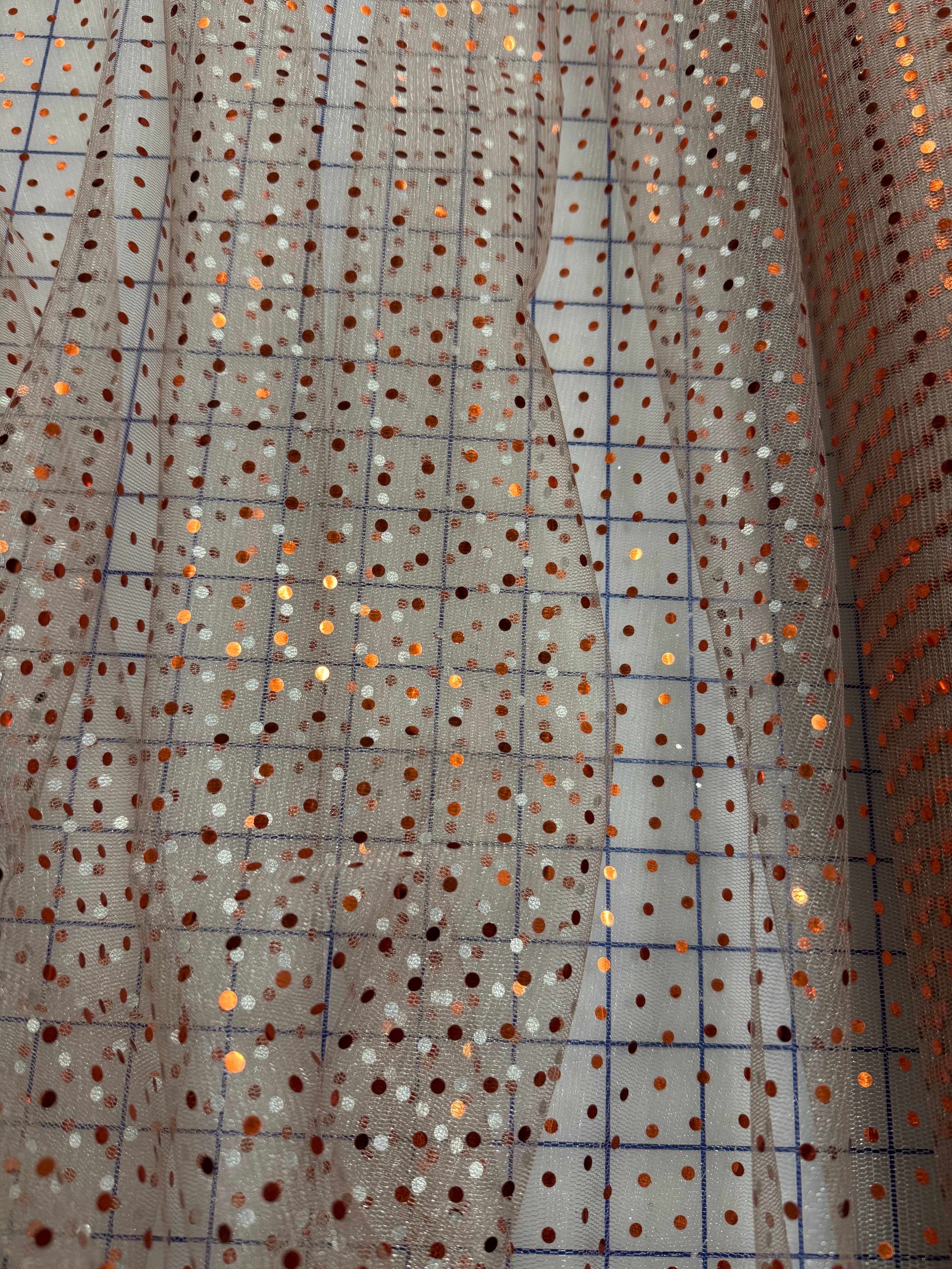 Priced per yard. Tan with copper hologram-dot tulle, 58-inches wide. Perfect replacement for the discontinued enhanced sparkle tulle! Absolutely does not shed at all!