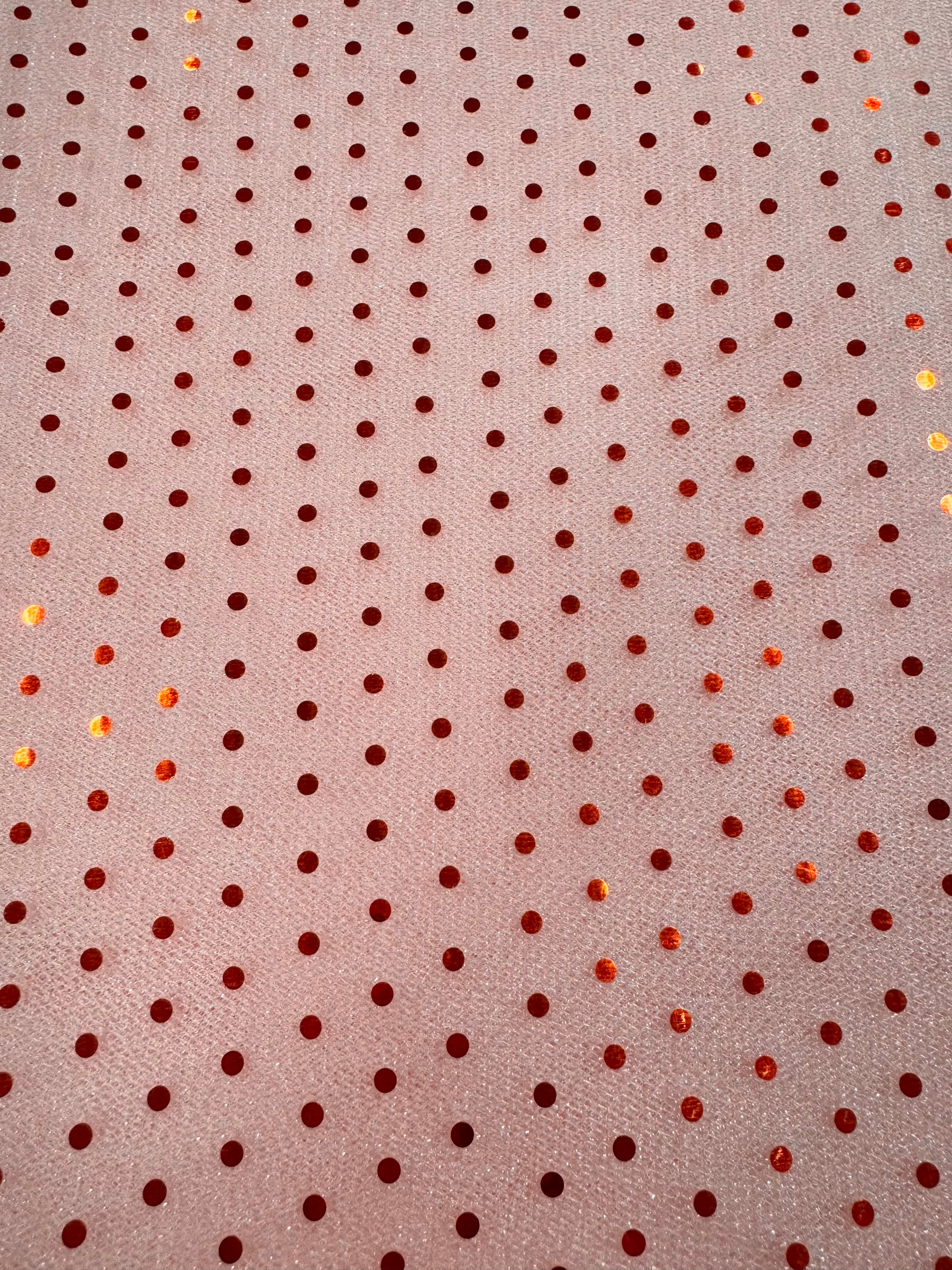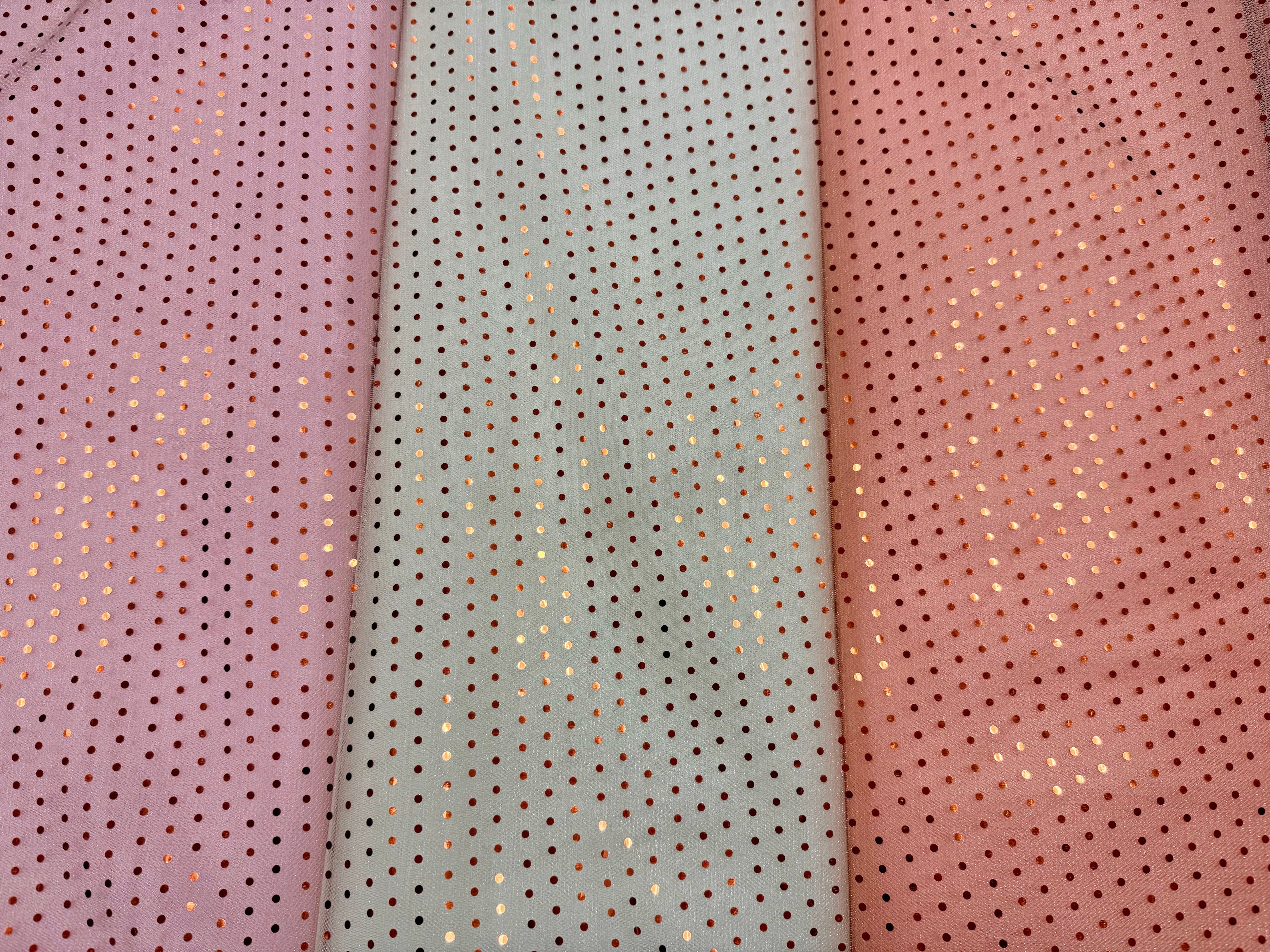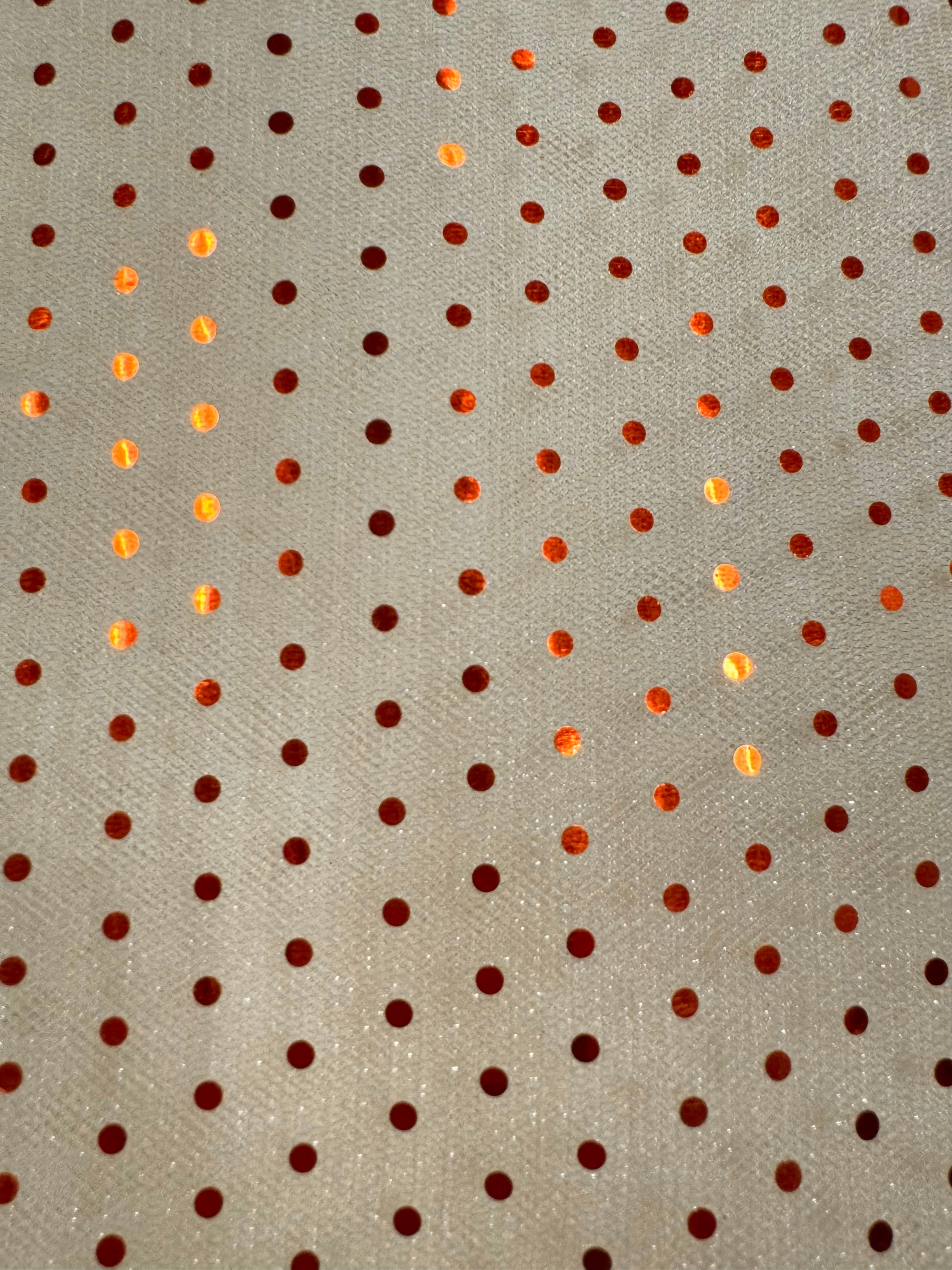 Priced per yard. Tan with copper hologram-dot tulle, 58-inches wide. Perfect replacement for the discontinued enhanced sparkle tulle! Absolutely does not shed at all!