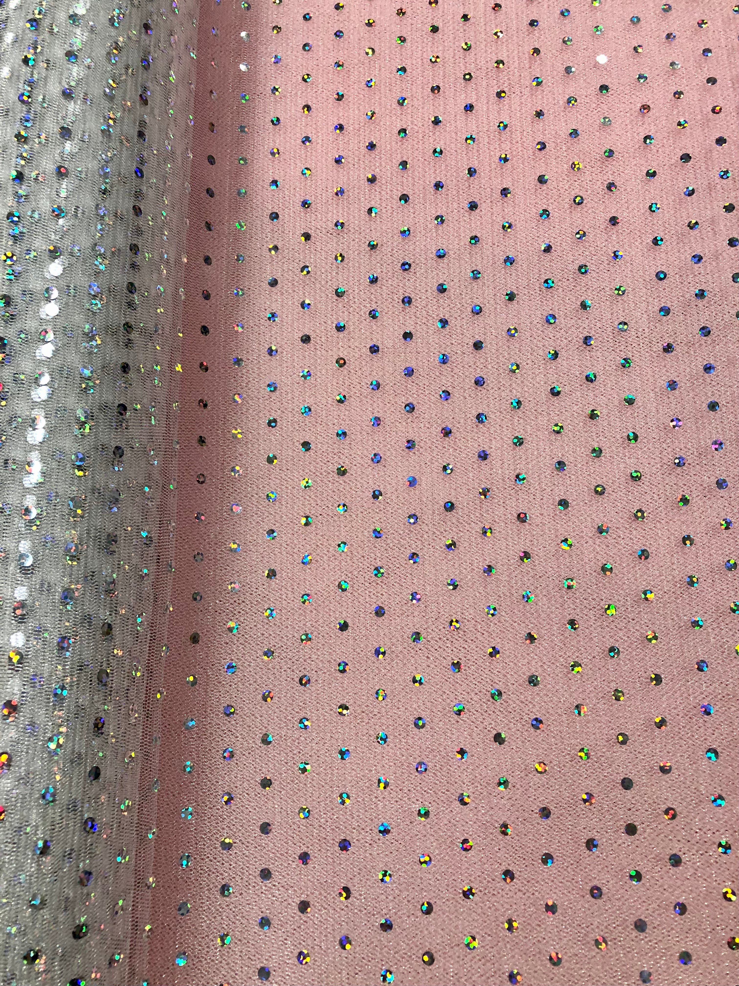 Priced per yard. White with iridescent hologram-dot tulle, 58-inches wide. Perfect replacement for the discontinued enhanced sparkle tulle! Absolutely does not shed at all!