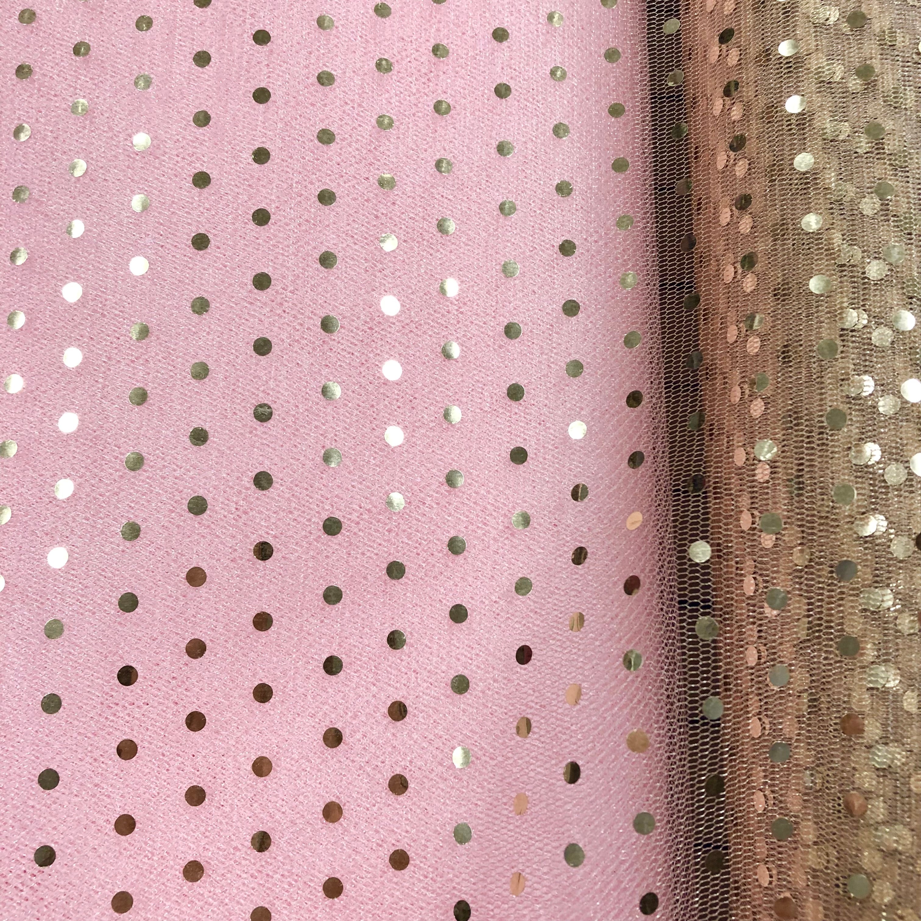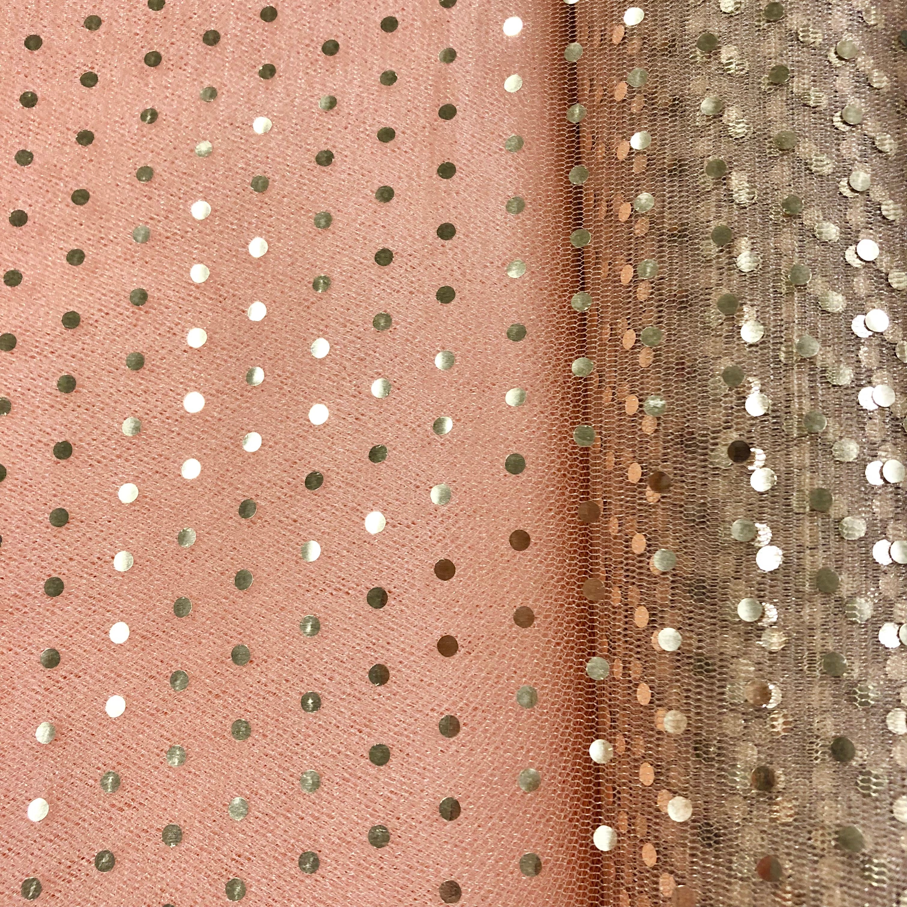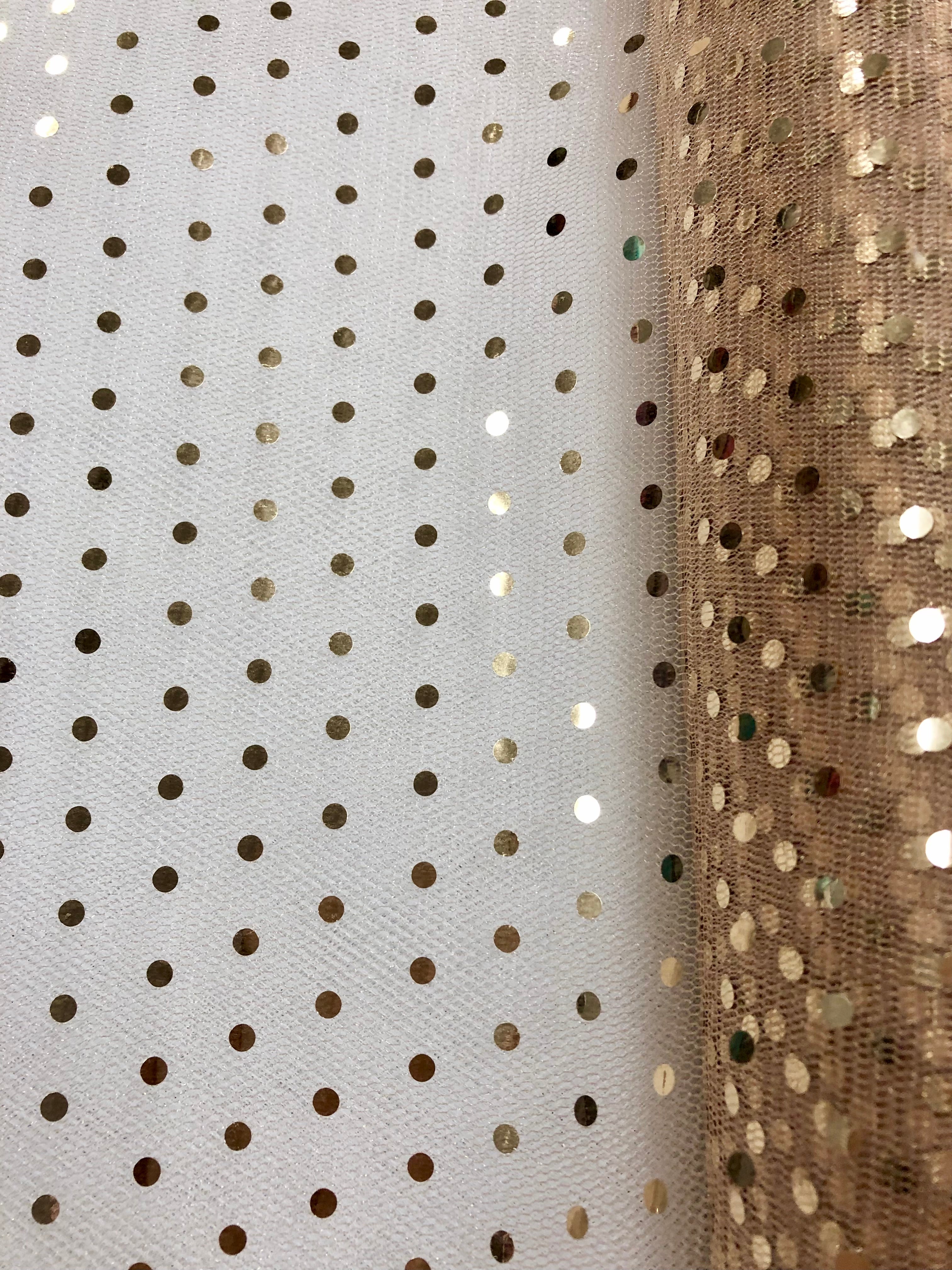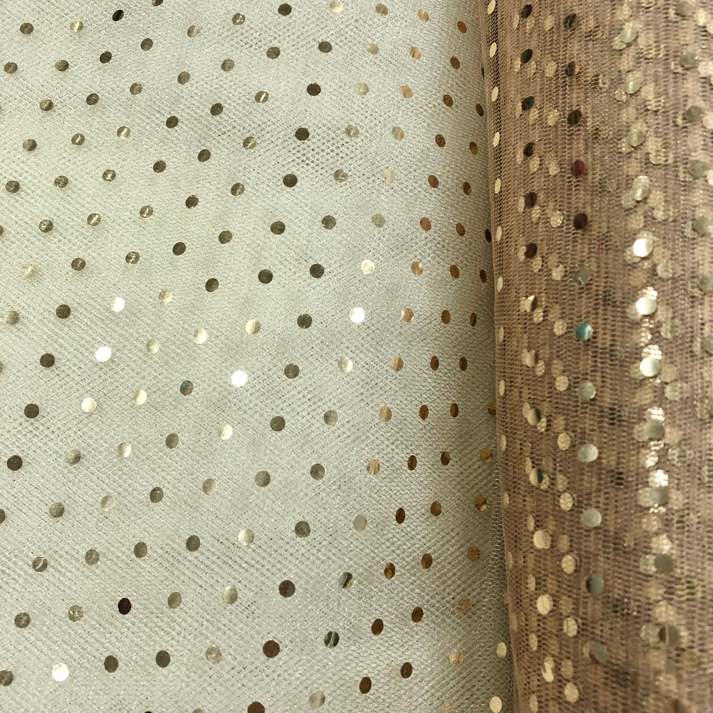 Priced per yard.Beige with gold hologram-dot tulle, 58-inches wide. Perfect replacement for the discontinued enhanced sparkle tulle! Absolutely does not shed at all!