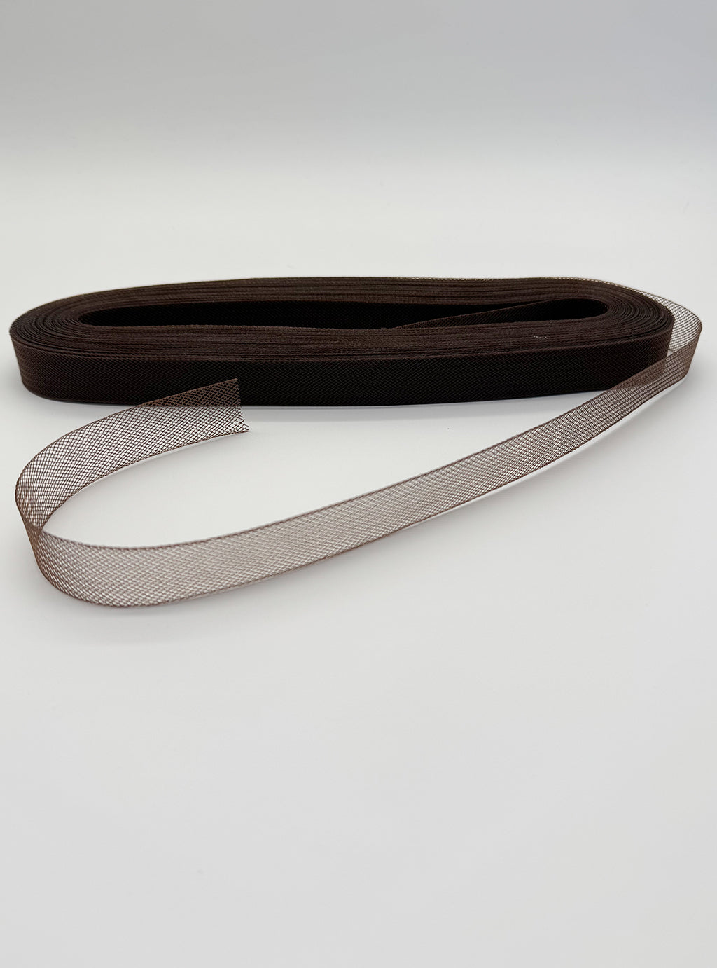 Priced per yard. Dark Brown. 1-inch heavy, stiff horsehair. Great for use in tiaras, costume embellishment, ribbon candy tutus, etc. Matches well for medium to dark brown hair.