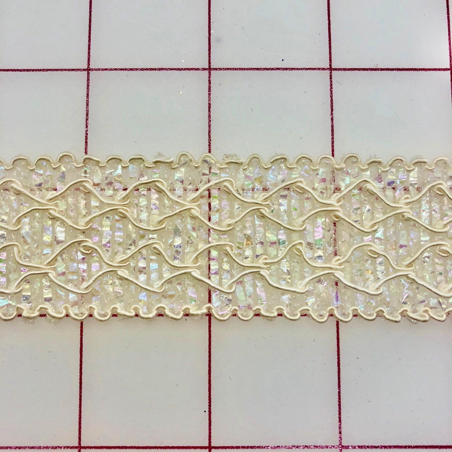 Priced per yard. Elegant, custom, iridescent trim. 1.25-inches wide. Perfect for many embellishments. Cannot be re-ordered.