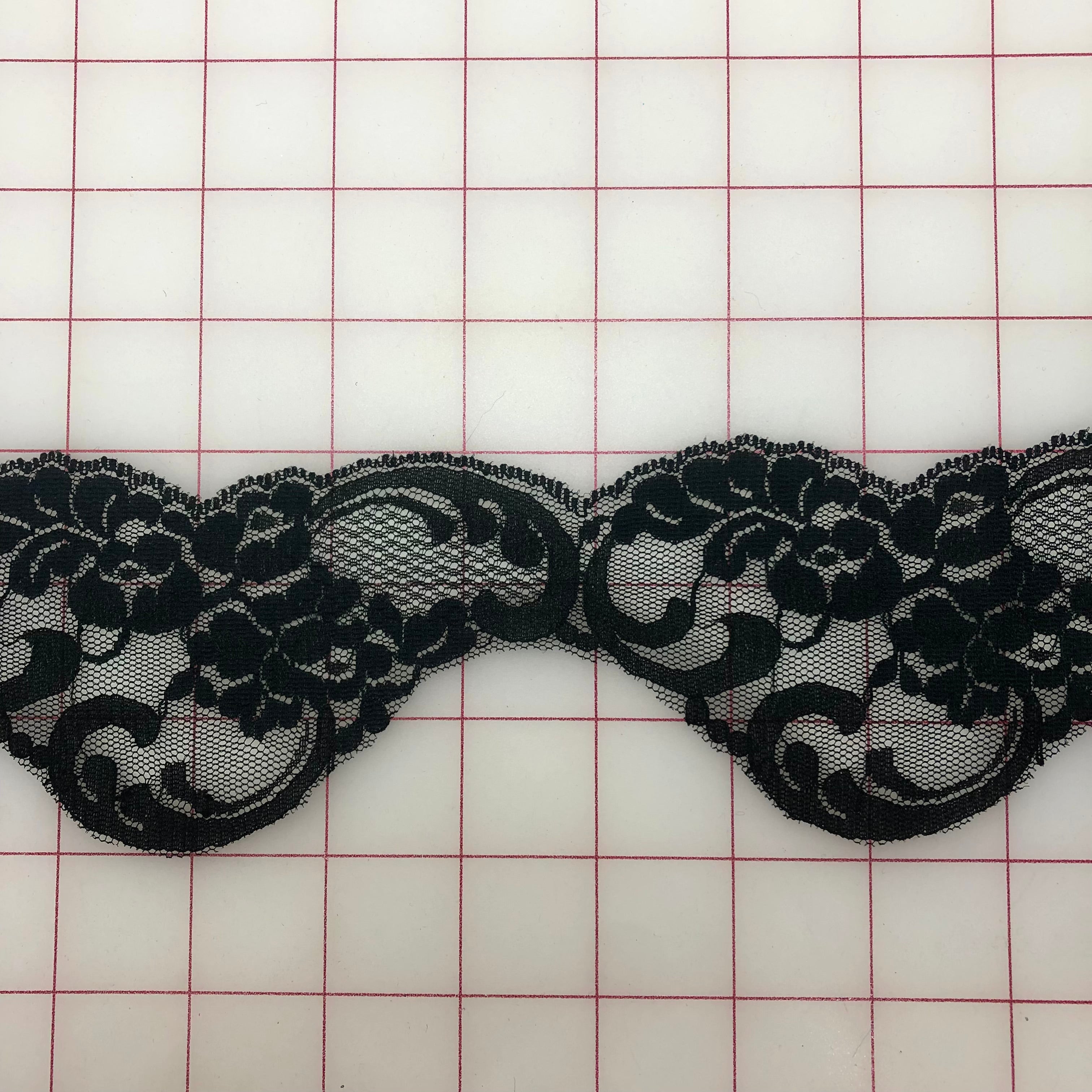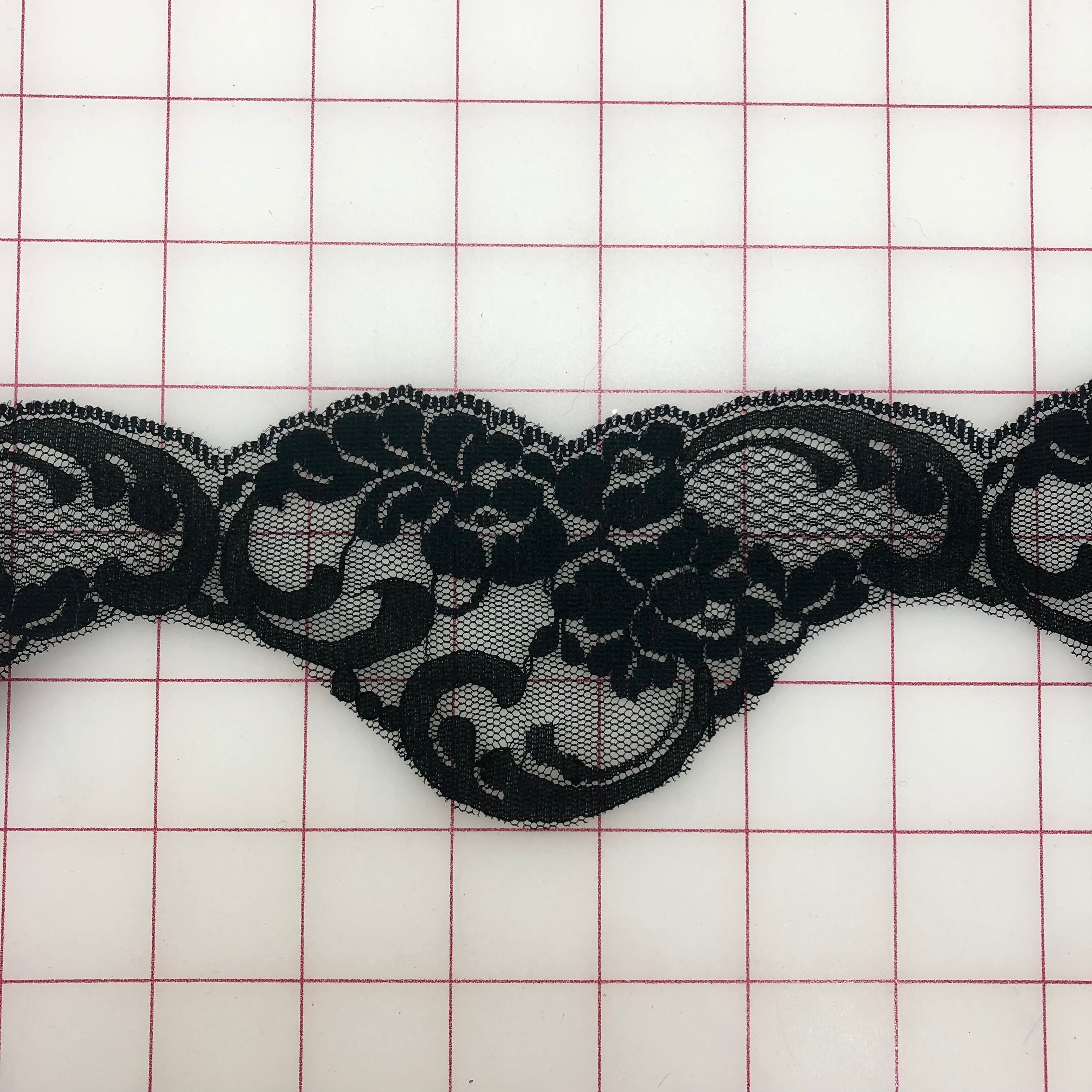 Priced per yard. Elegant, black scalloped lace trim. 1.25-3-inches wide.
