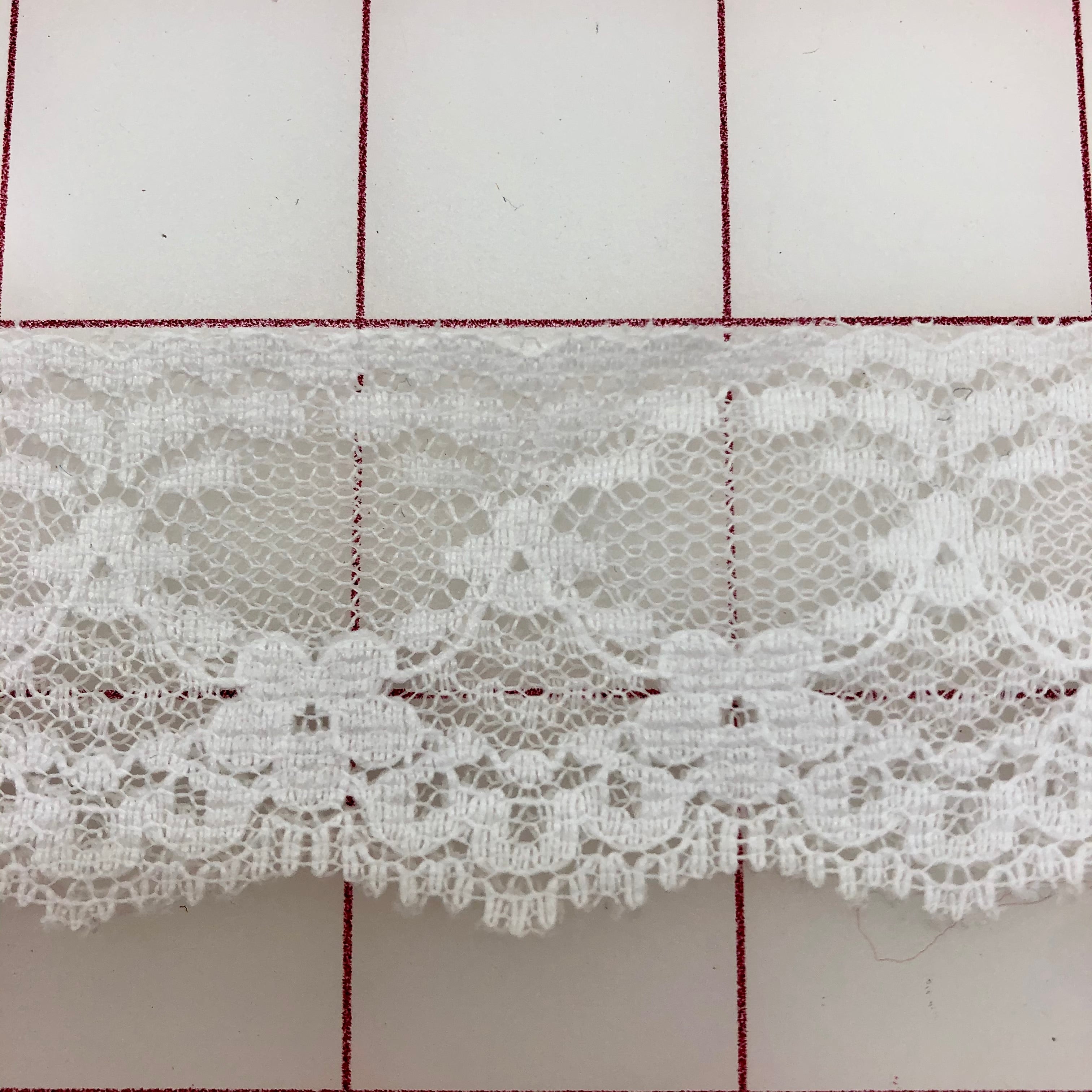 Priced per yard. Beautiful, scalloped-edge white lace trim. 1.5-inches wide. Perfect for embellishing tutus, party dresses in the Nutcracker, and other elegant dress costumes. Dyes easily. Cannot be re-ordered.