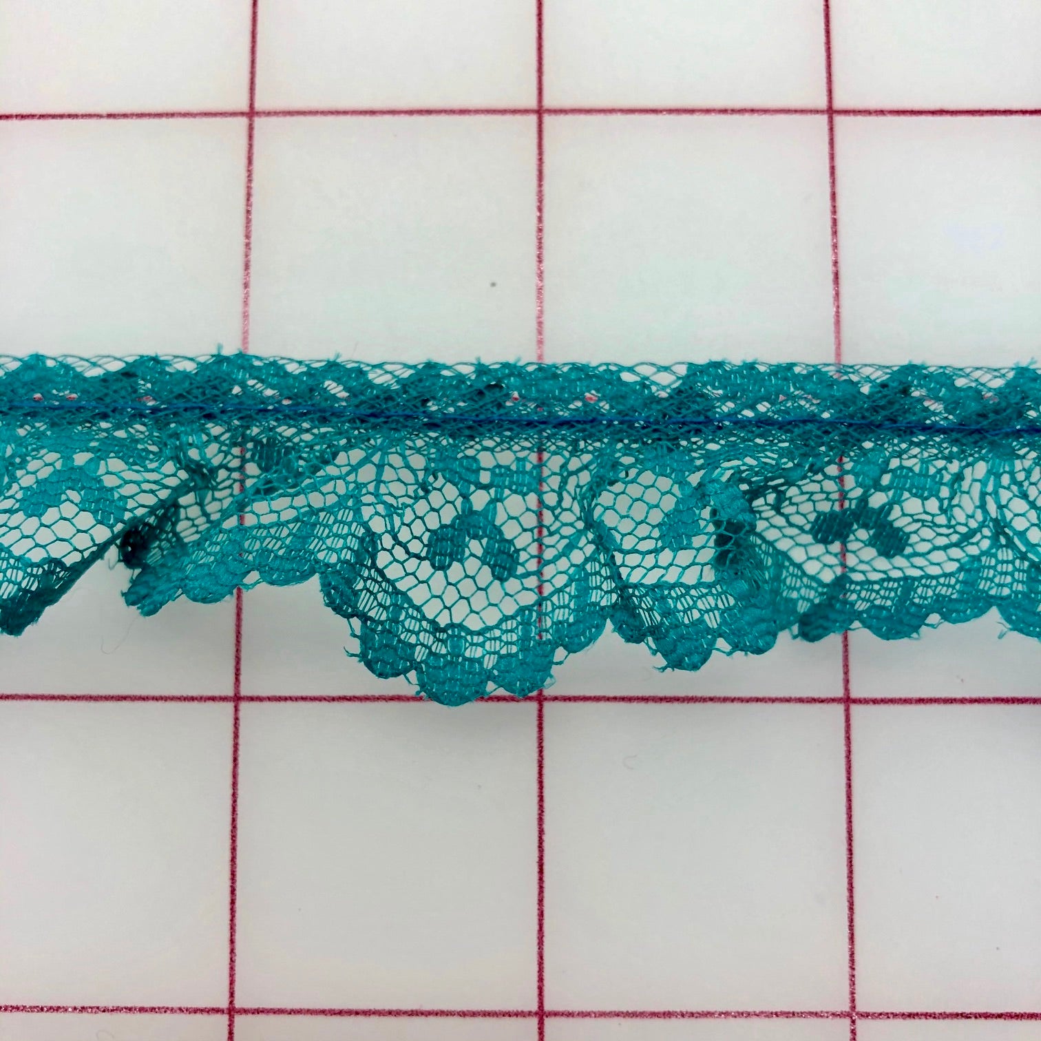 Priced per yard. Teal ruffled lace. 1-inch wide. Perfect for many embellishments. Cannot be re-ordered.