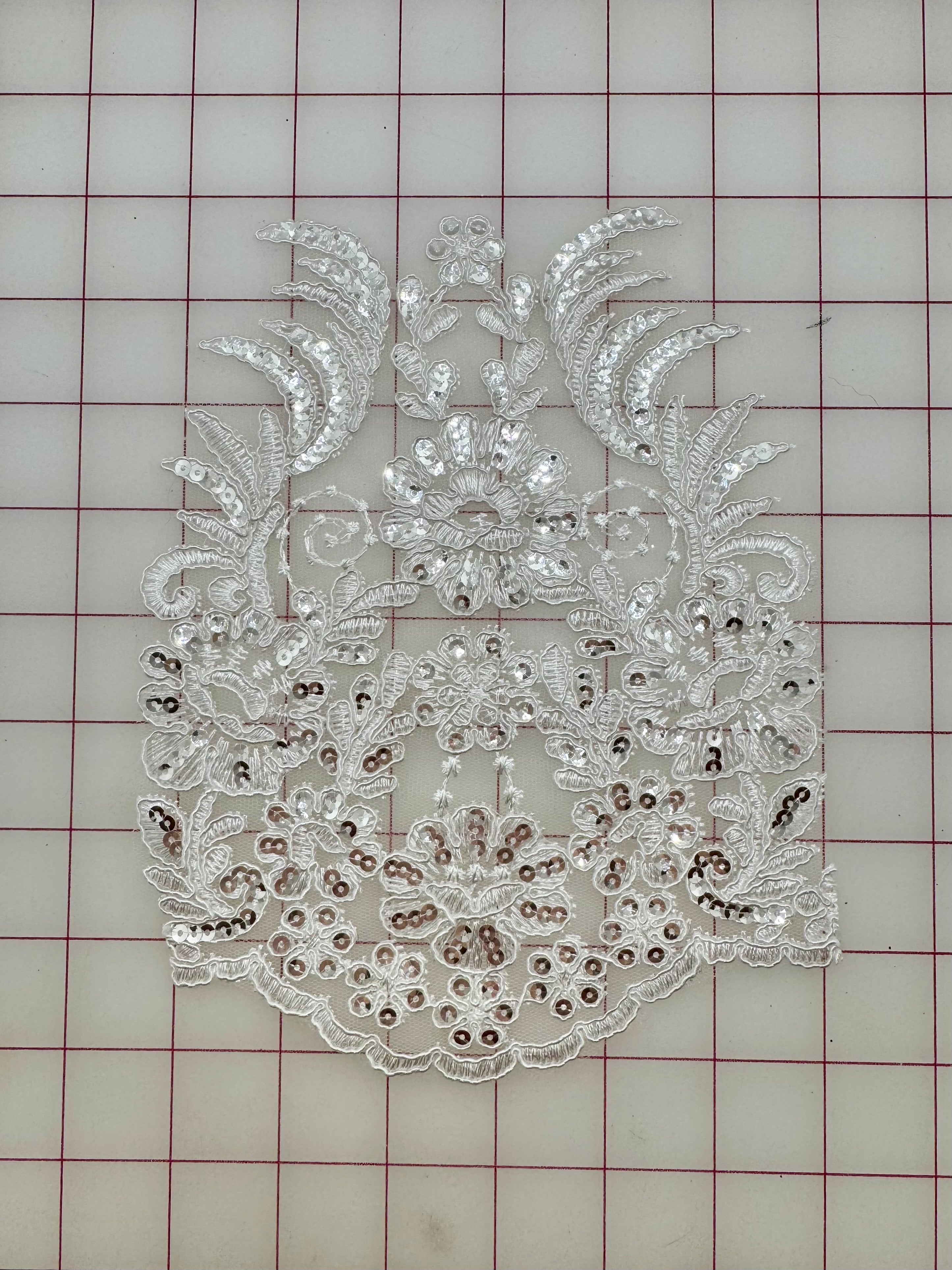 Priced per motif. White sequined, corded lace applique. Dye-able.