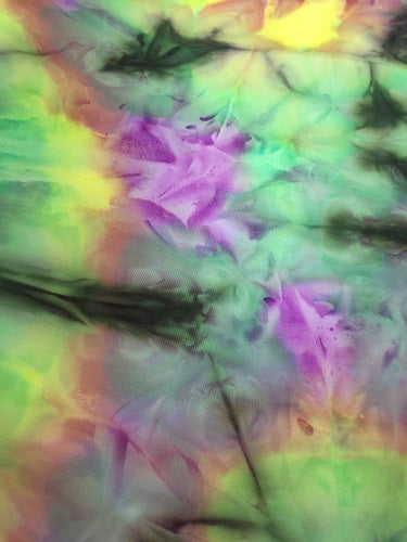 Priced per yard. Green/Yellow/Purple tie-dye nylon matte, 60-inches wide.