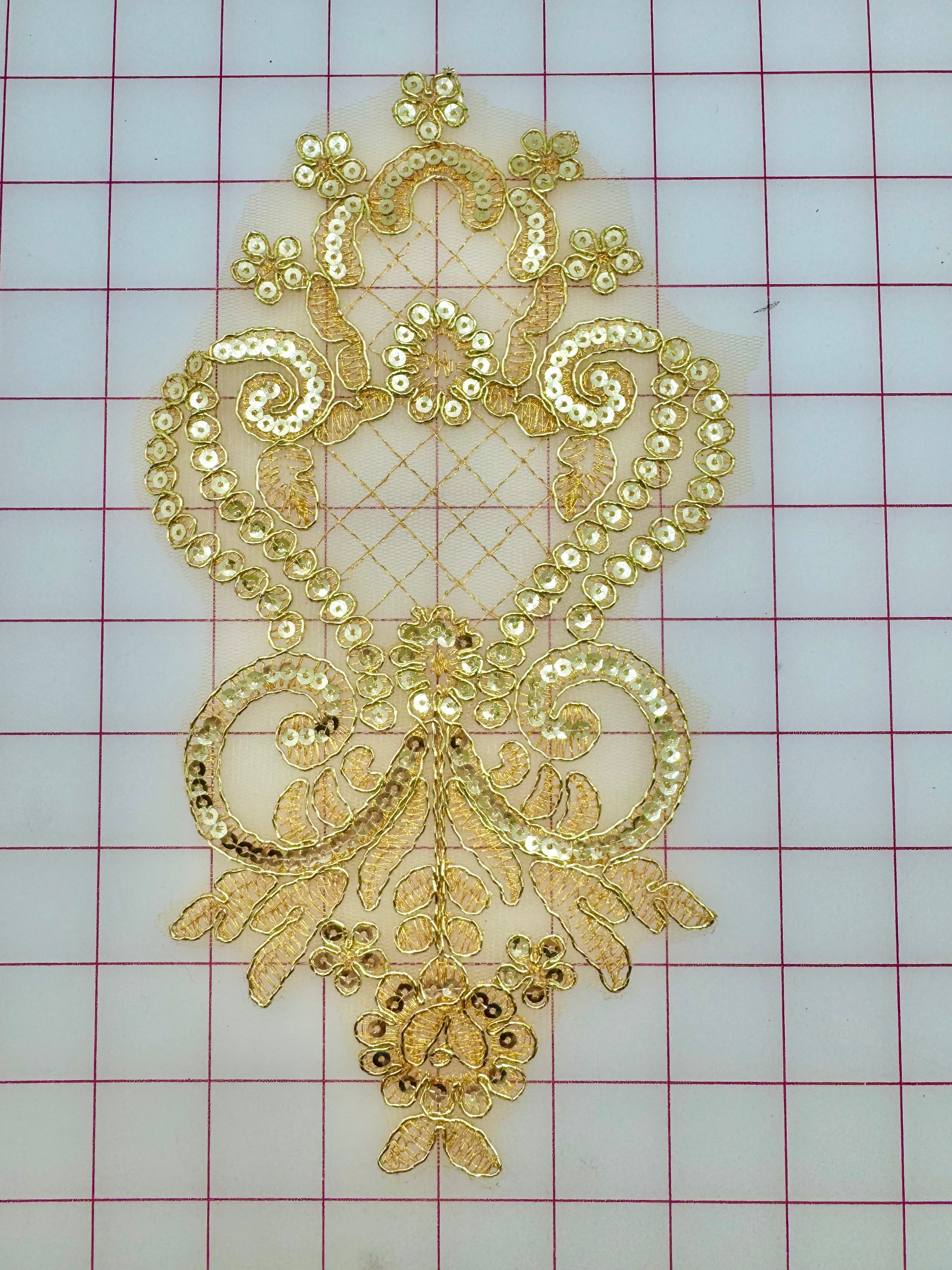 Priced per applique. Beautiful, lightweight, gold metallic sequined lace appliques.