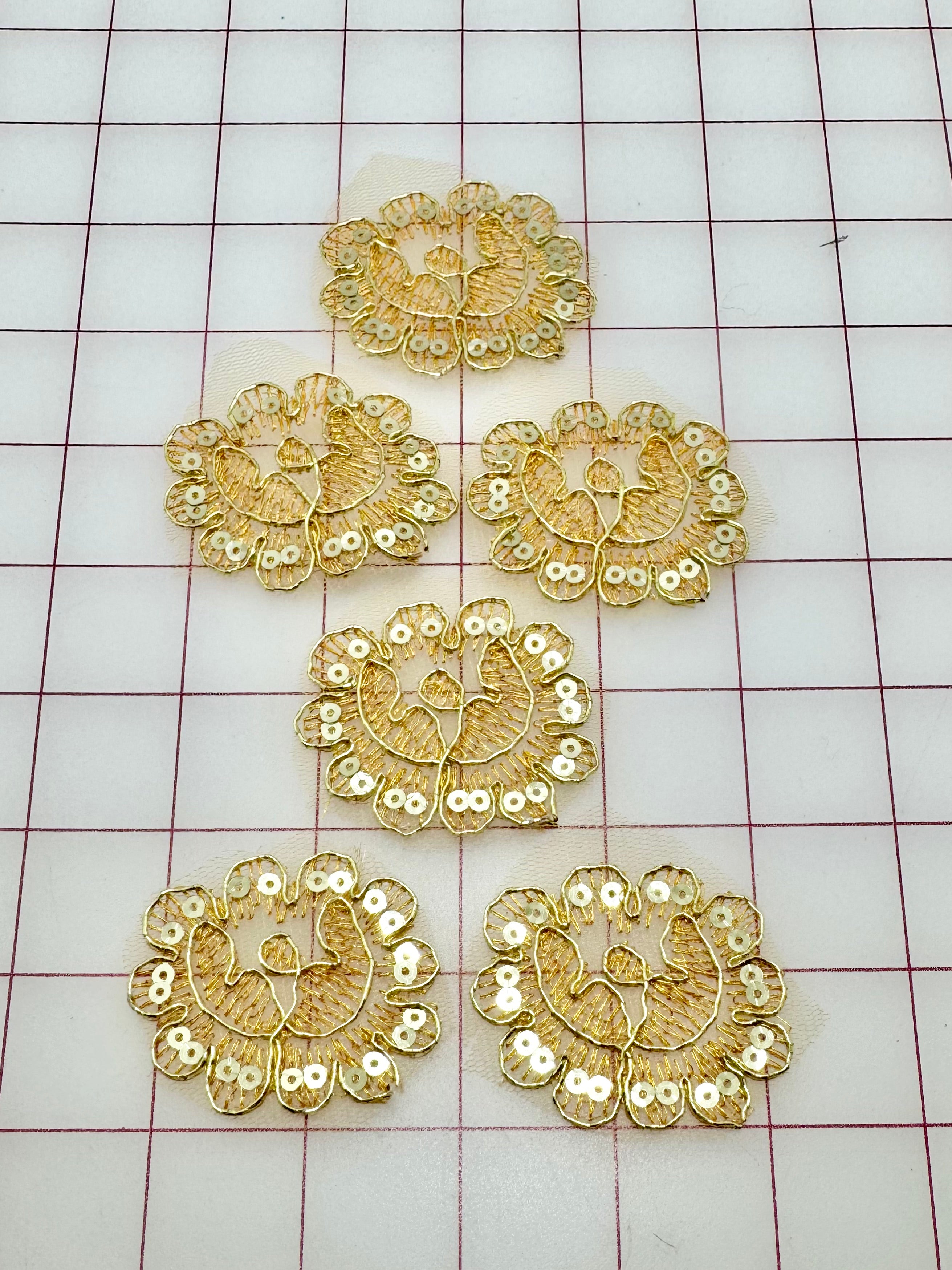 Priced per 6-pack of appliques. Beautiful, lightweight, gold metallic sequined lace.