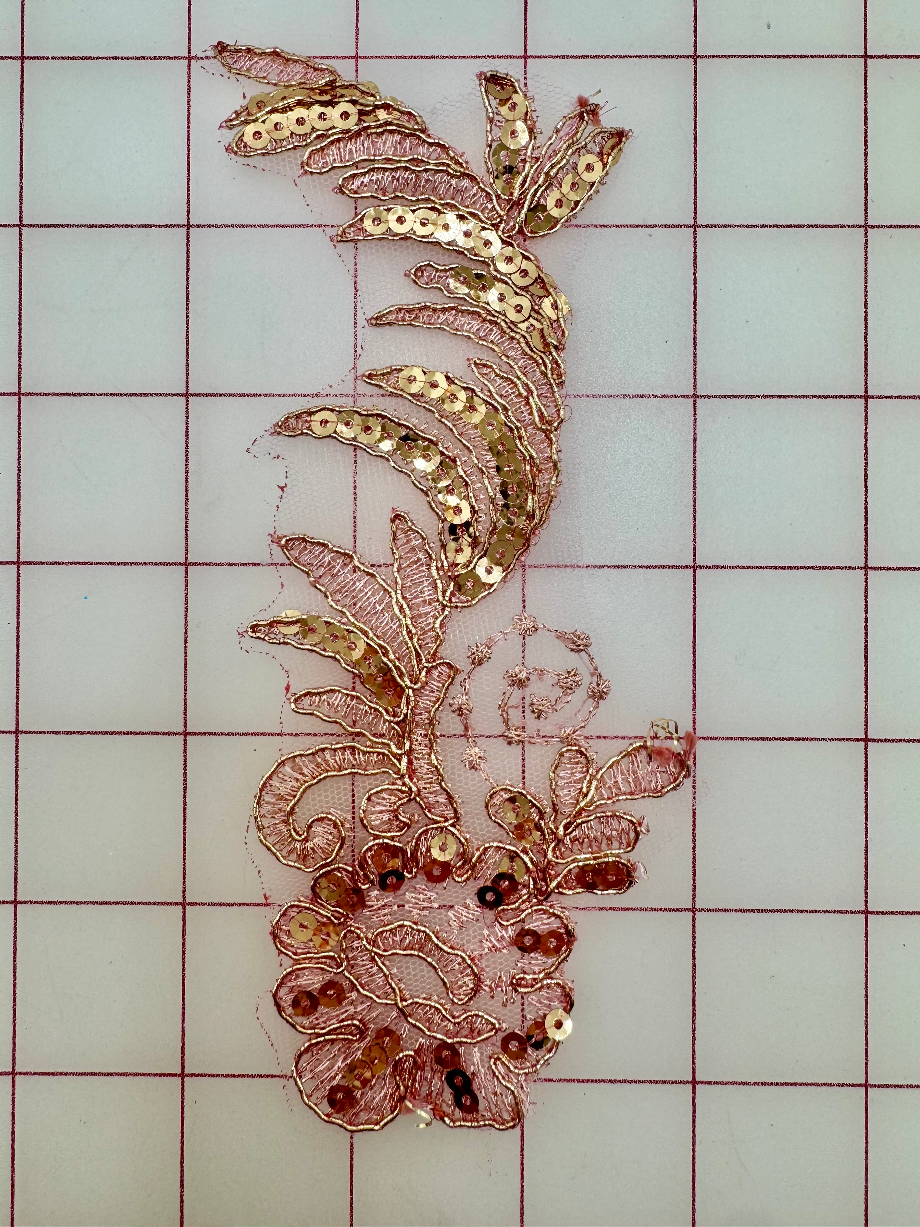 Priced per motif. Beautiful, lightweight, custom-dyed rose gold metallic sequined lace.