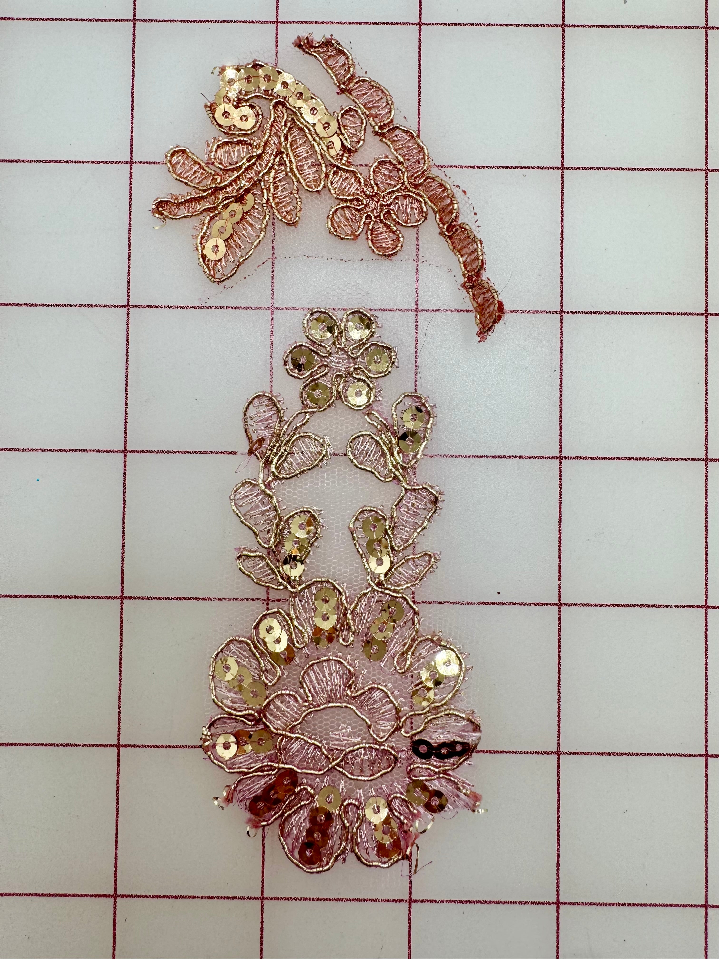 Priced per 2-motif pack. Beautiful, lightweight, custom-dyed rose gold metallic sequined lace.