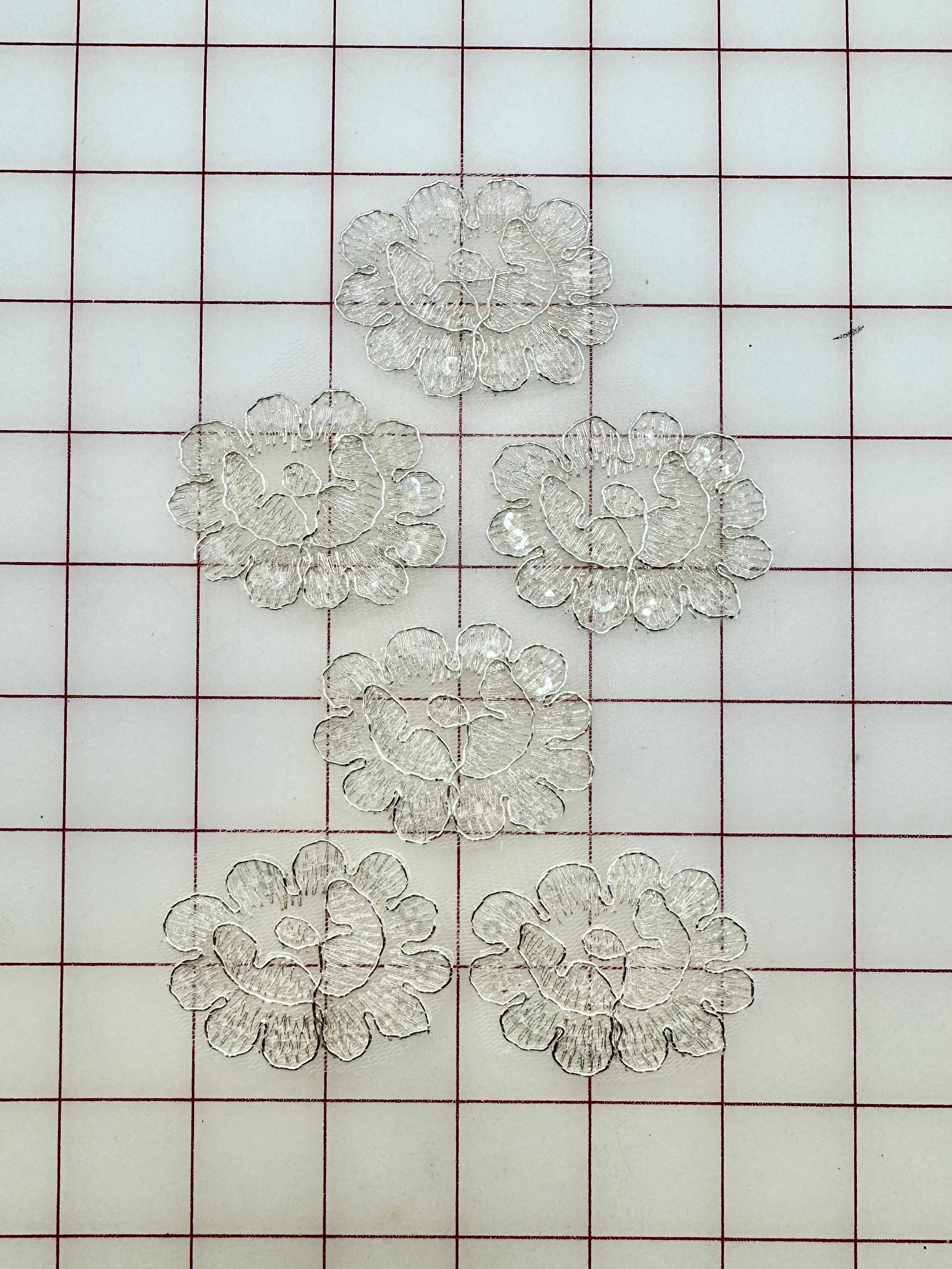 Priced per 6-pack of appliques. Beautiful, lightweight, silver metallic sequined lace.