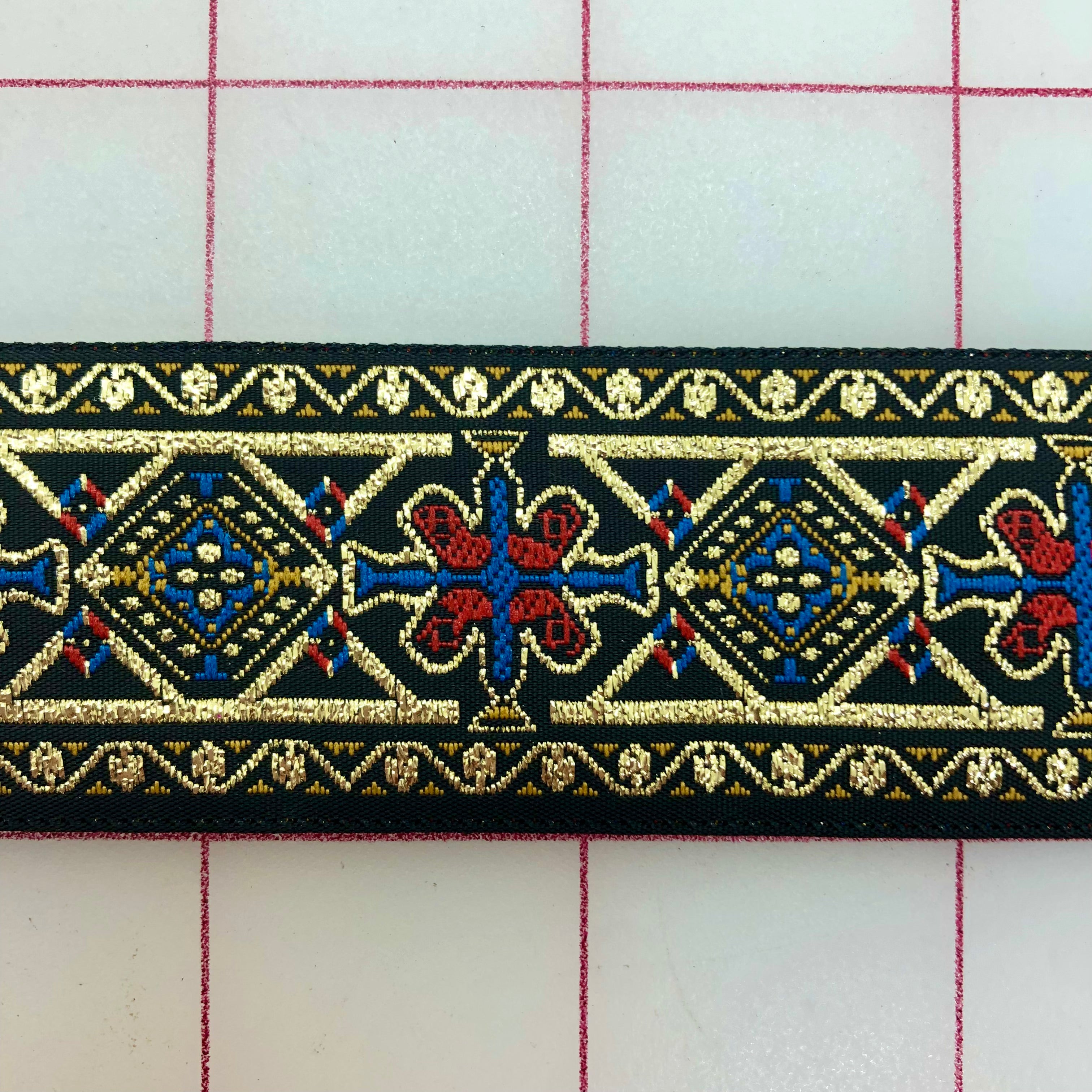 Priced per yard. Beautiful vintage black, gold, red, and blue metallic ribbon trim, 1-inch wide.