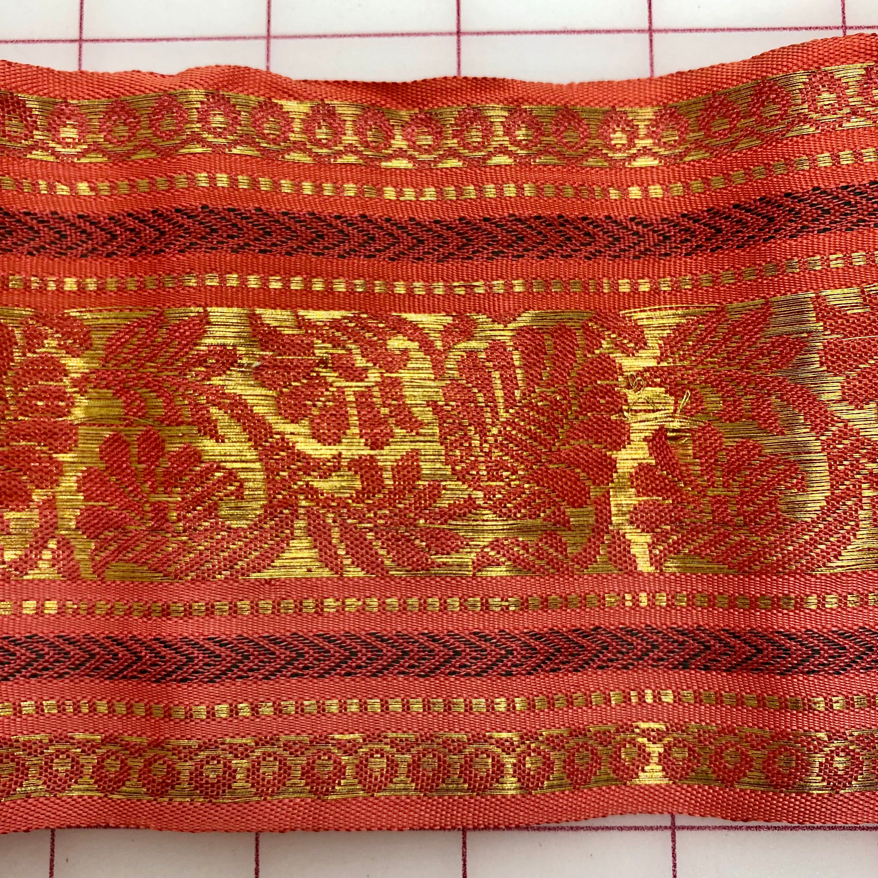 Priced per 32-inch piece. Classic vintage gold metallic ribbon with red and green stripes. 3.5-inches wide.