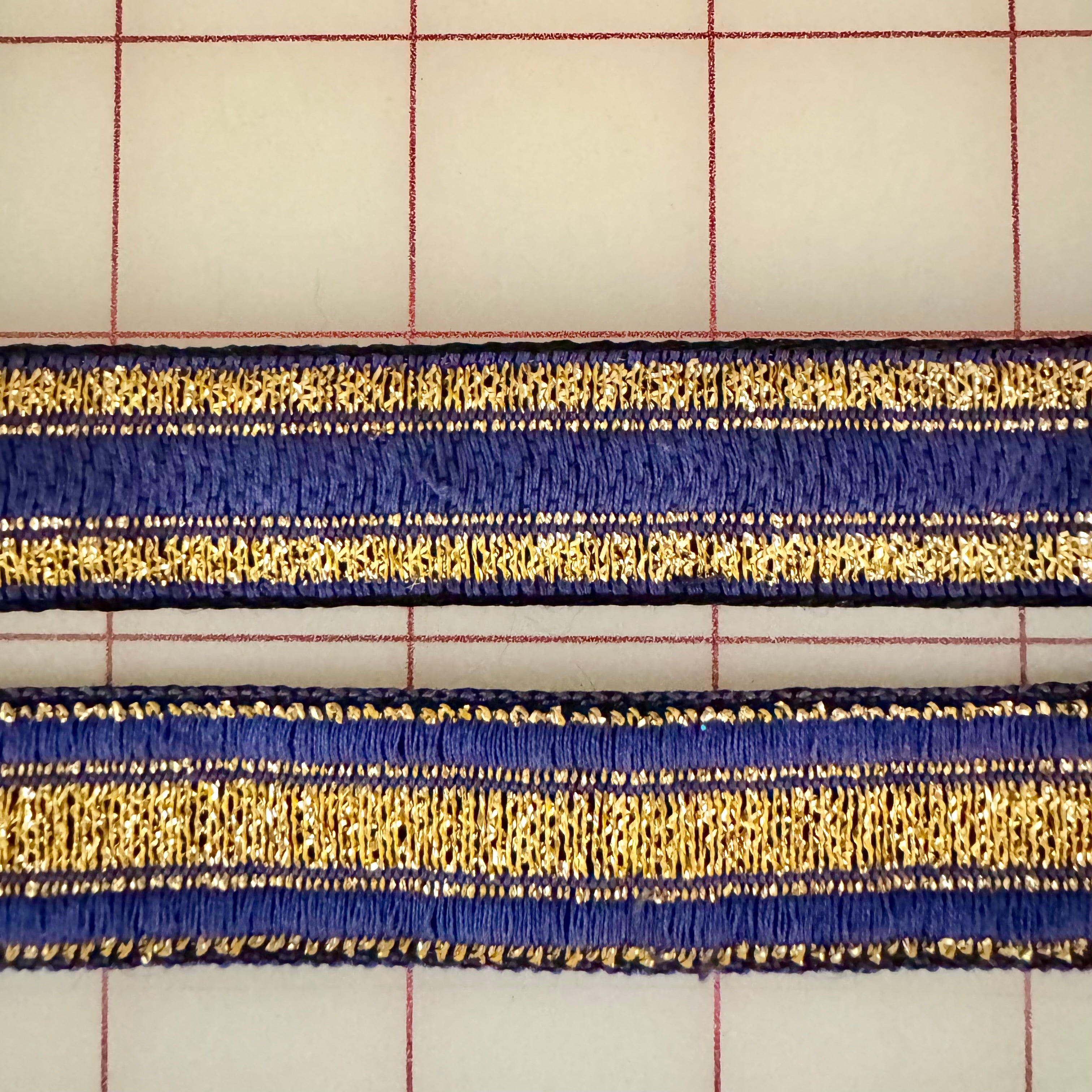 Priced per 1.75 yards in two pieces. Beautiful vintage blue and metallic gold ribbon trim, 7/8-inch wide. In two pieces - 58-inches, and 9-inches.