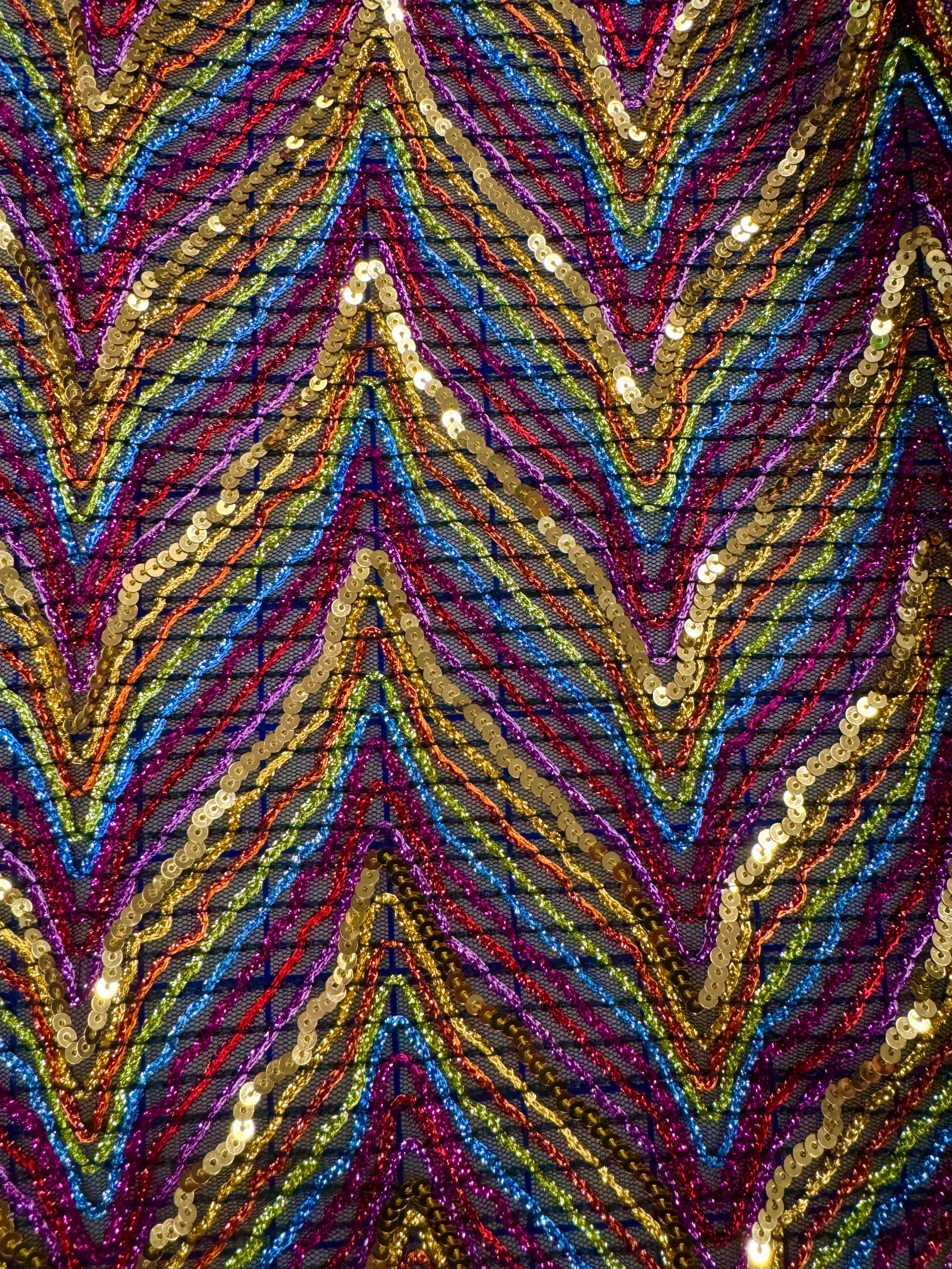 Priced per yard. This gorgeous metallic multi-color vorded and sequined fabric has some stretch in it - perfect for many dance projects, and much more.
