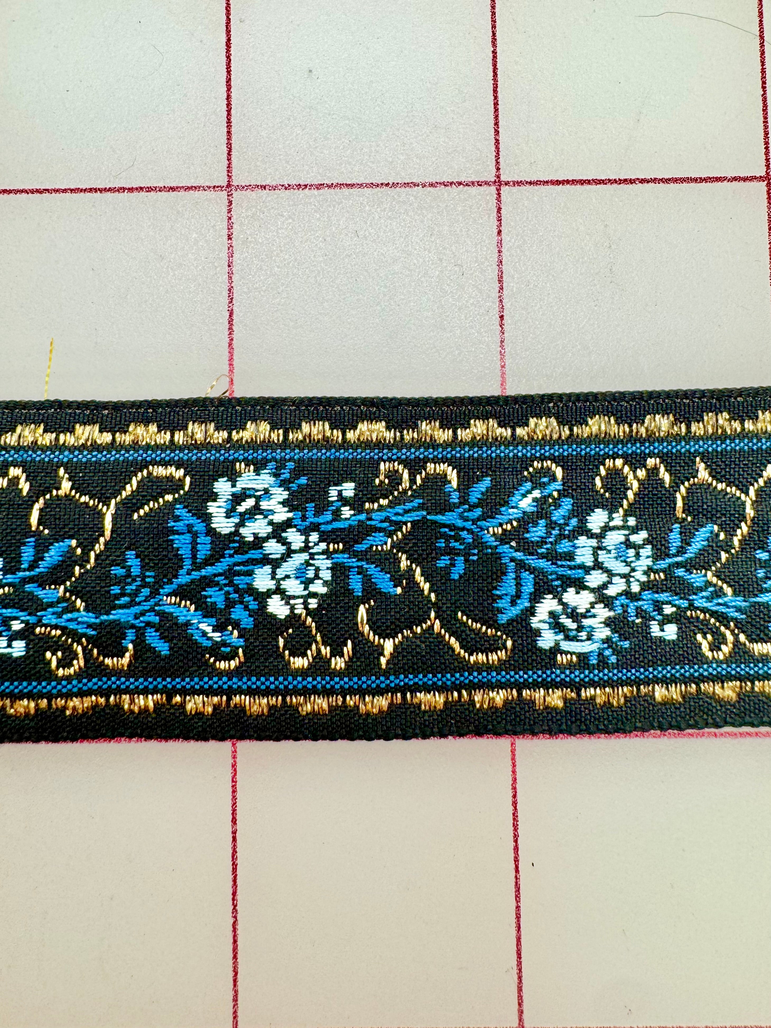 Priced per yard. Stunning black ribbon with gold metallic and shades of blue trim. Floral design. Vintage. 1.125-inches wide.