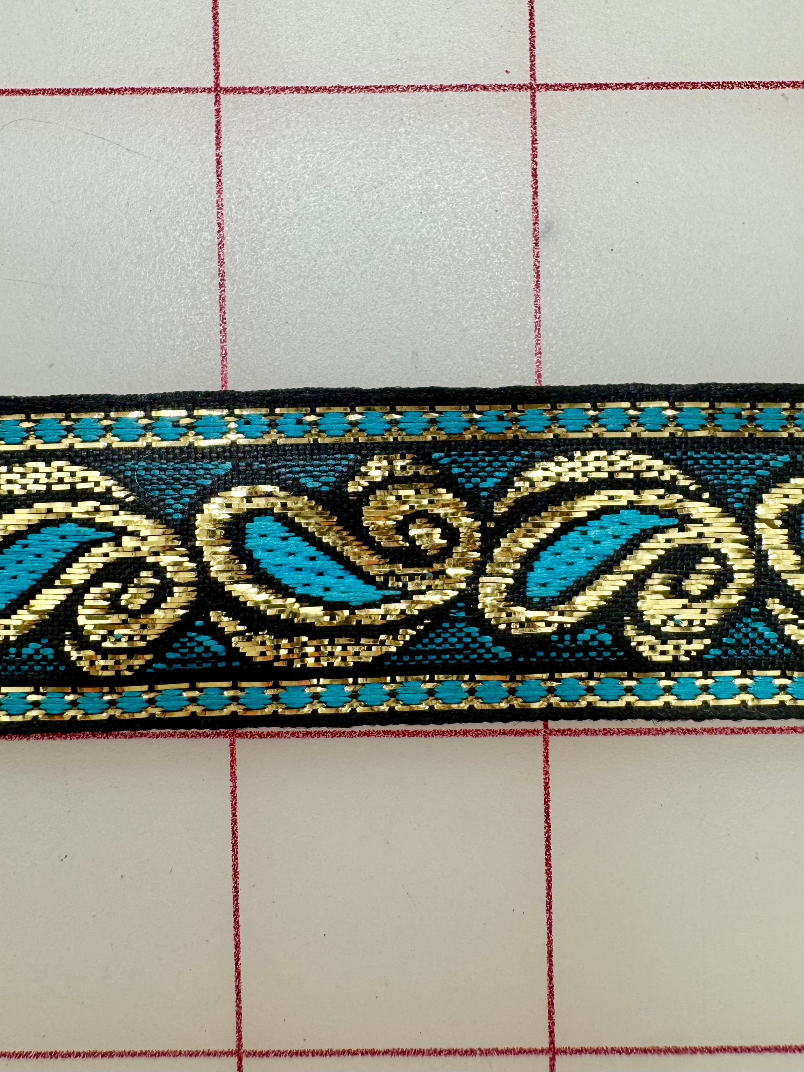 Priced per yard. Stunning black ribbon with gold metallic and teal trim. Paisley design. Vintage. 7/8-inch wide.