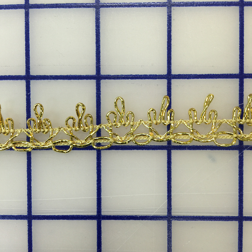 Priced per yard. Gold metallic "loopy" trim. 1/2-inch wide. Perfect for decorating both mens and womens costumes. 25% discount per 72-yard roll.