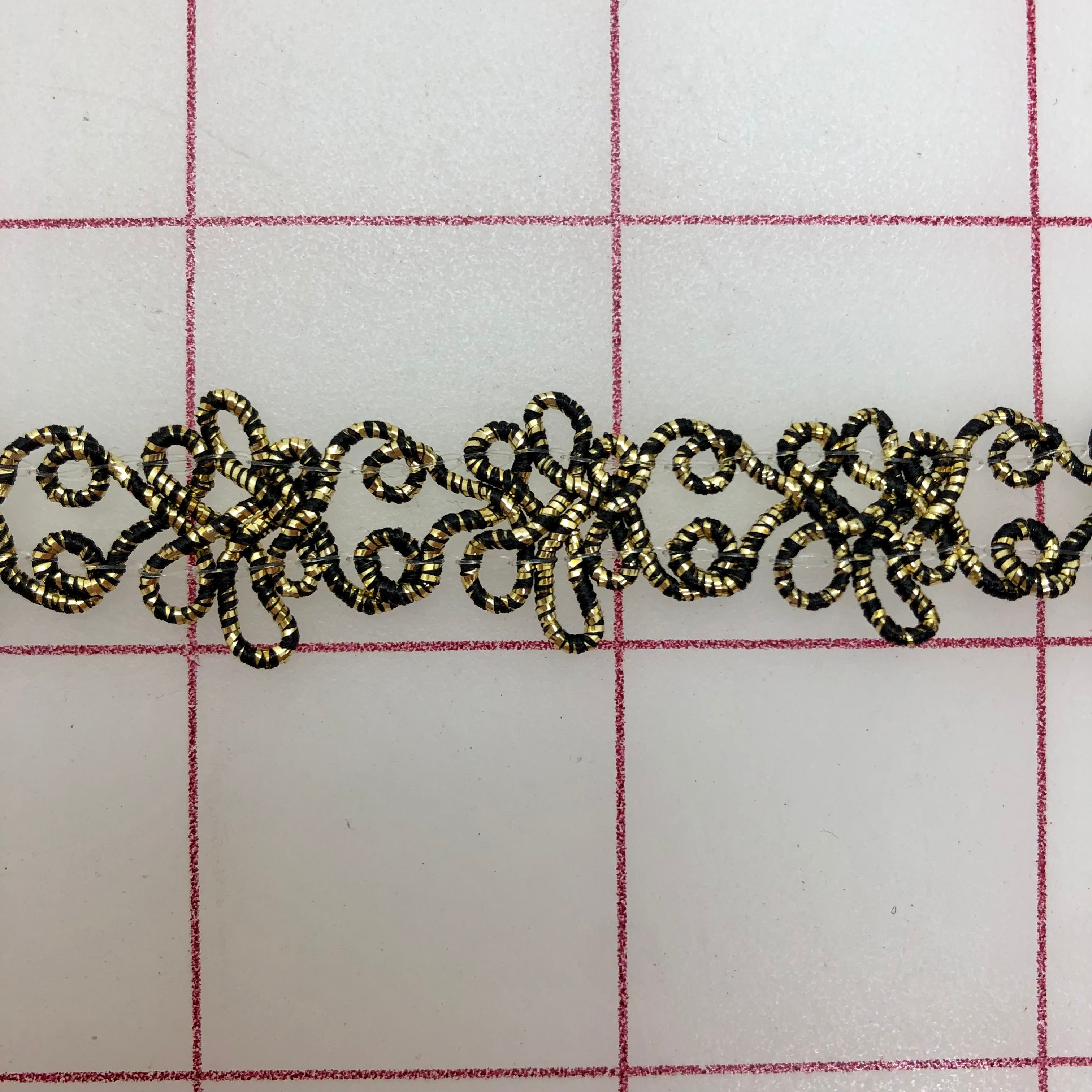 Priced per yard. Beautiful black and gold metallic loop braid. 1/2-inch wide.