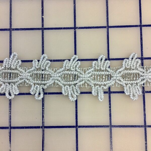 Priced per yard. Silver metallic lace trim. 1.25-inches wide.