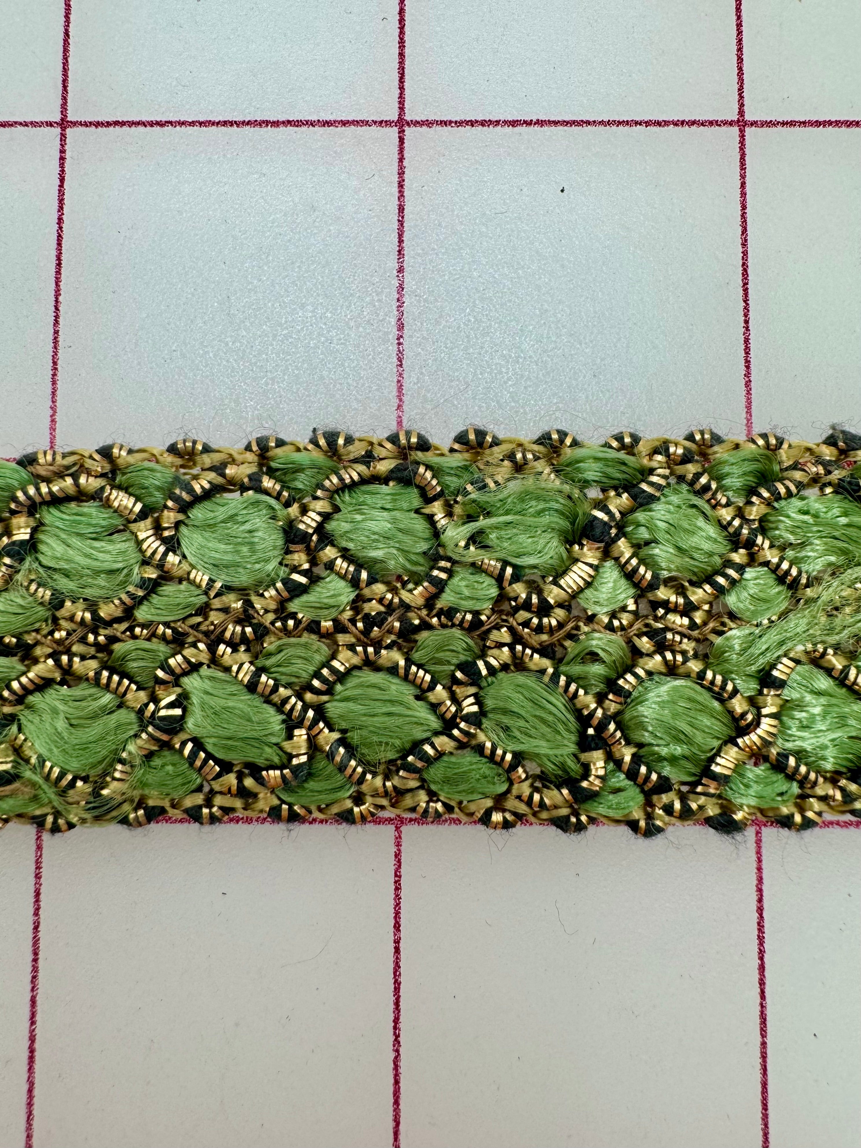 Priced per 3.25-yard piece. Beautiful vintage metallic gold and green trim. 1-inch wide.