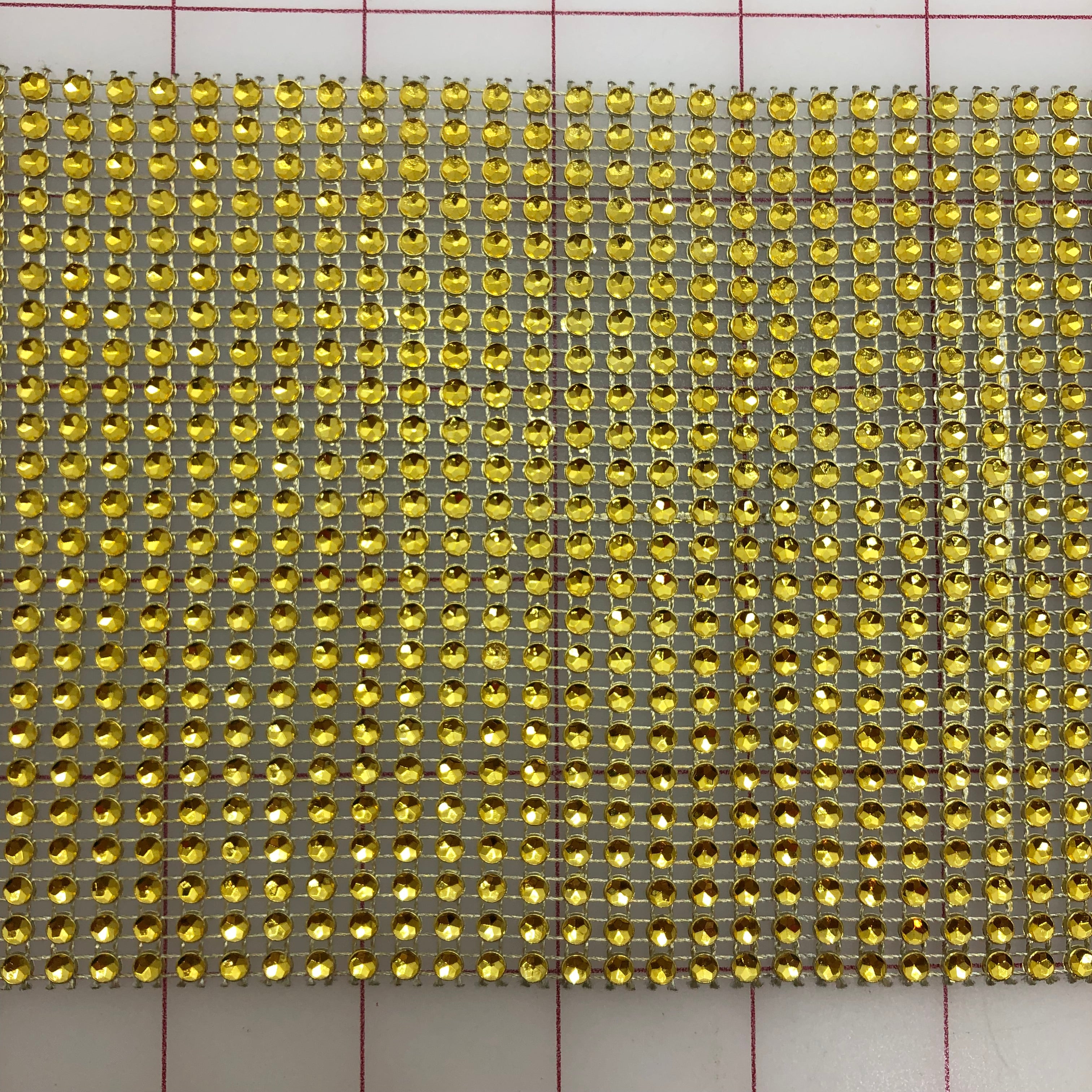 Priced per yard. Yellow-Gold, 24-row, 4-inch wide, sparkle bling cloth. Rhinestone fabric. Can be easily cut apart into rows or shapes. Great for creating embellishments.