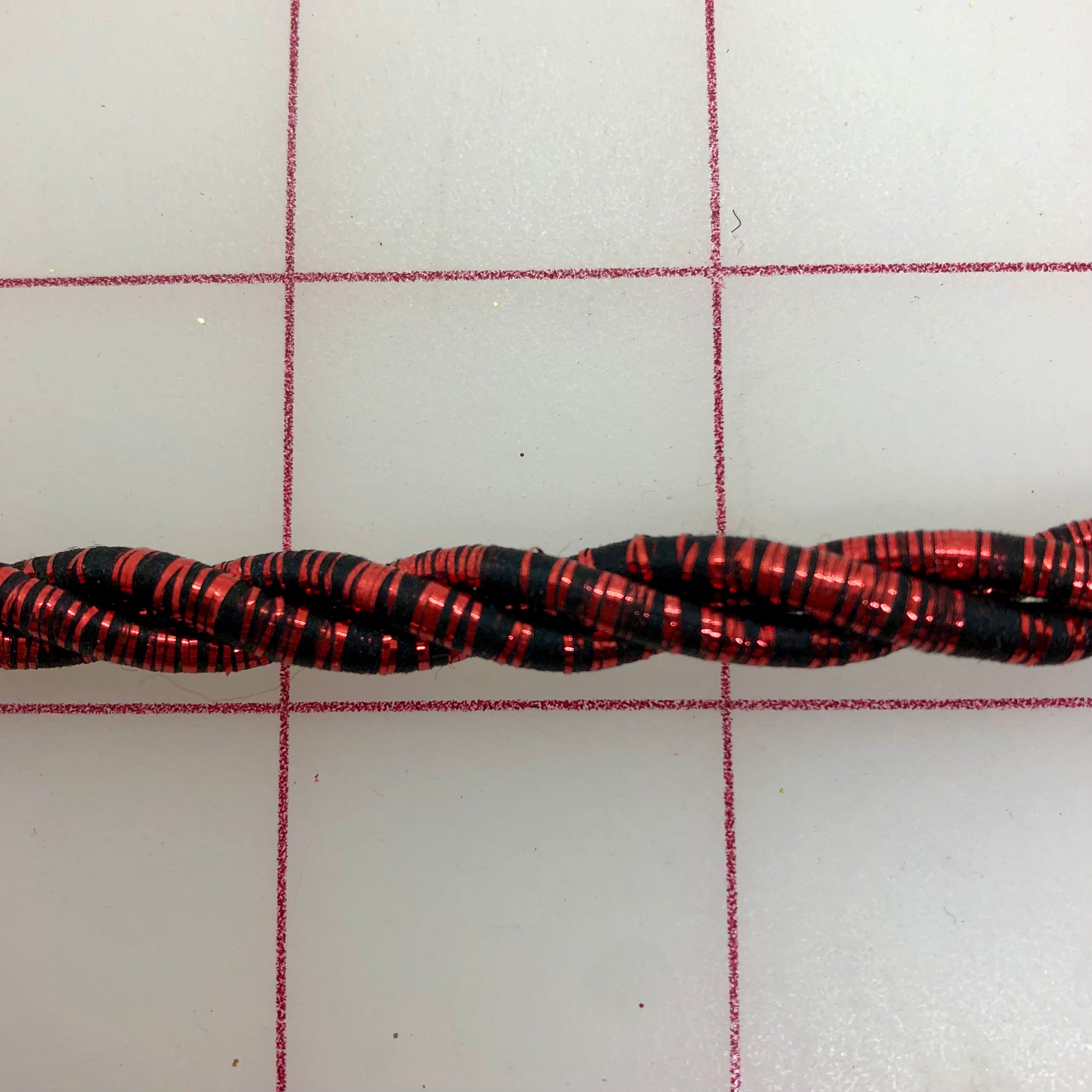 Priced per yard. Approximately 6mm wide. Red/Black metallic twisted cord.