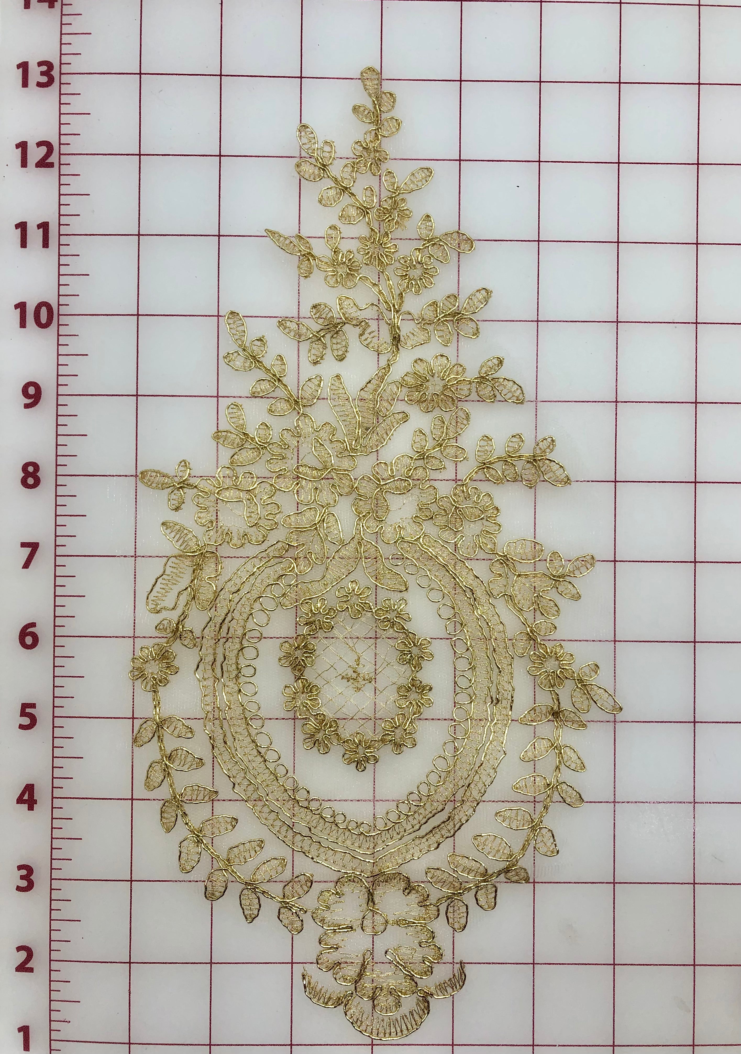 Priced per piece. Beautiful, lightweight, gold metallic corded lace motifs.