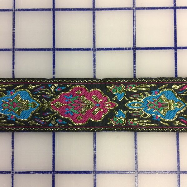 Priced per 5.75-yard piece. Beautiful black, magenta and turquoise jacquard trim. 1.25-inches wide.