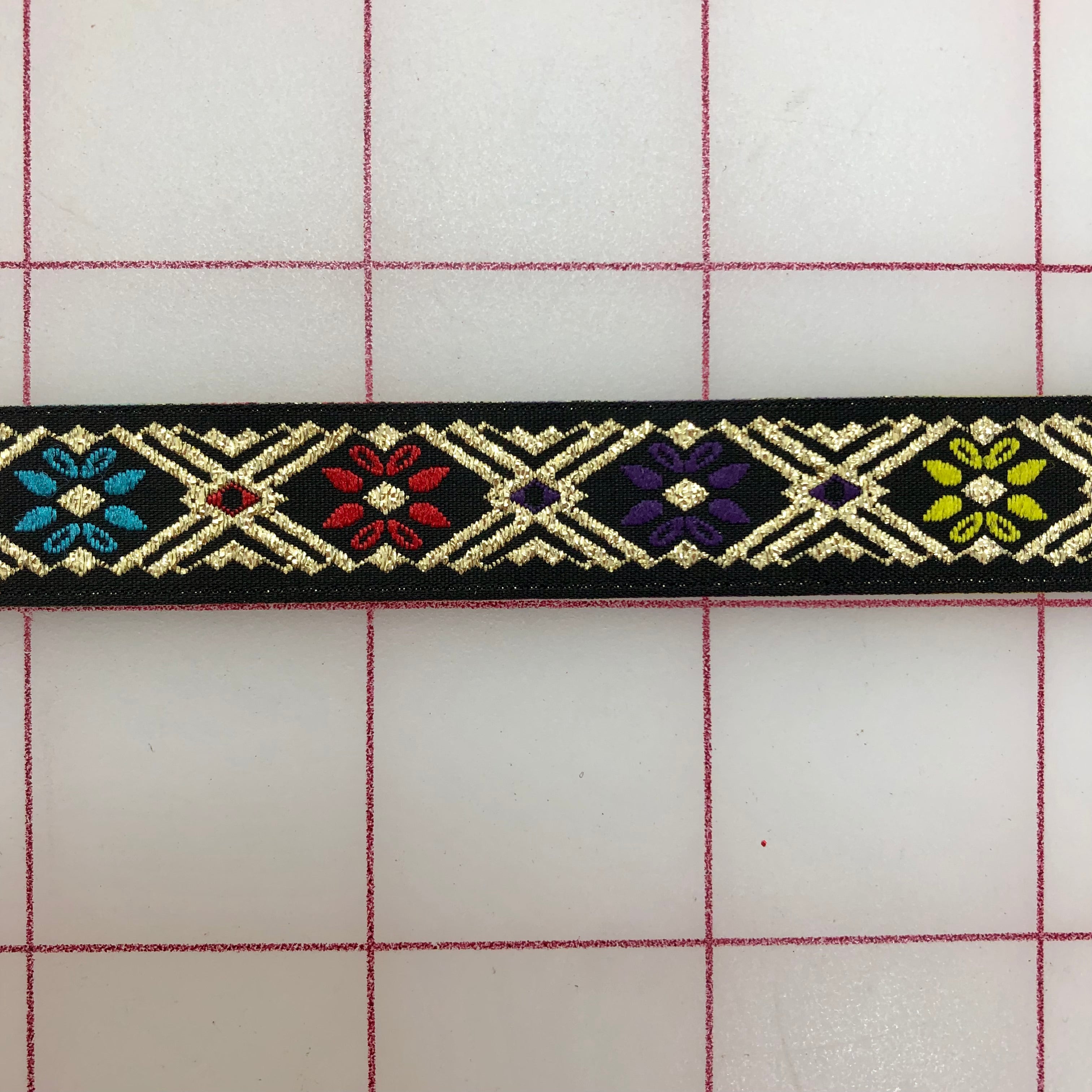 Priced per yard. Beautiful black, magenta, turquoise and purple metallic gold jacquard trim. 5/8-inches wide.
