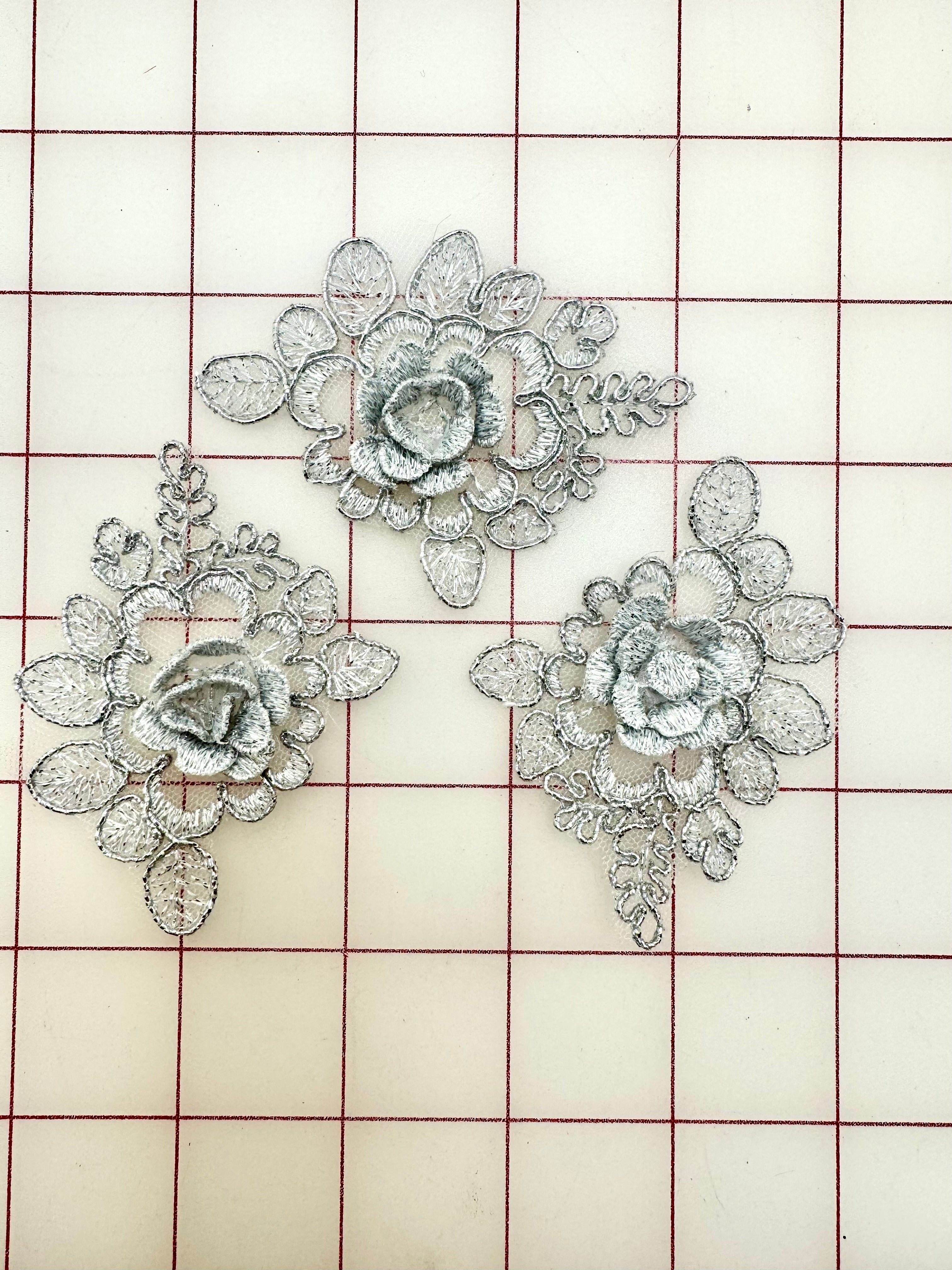 Priced per 3-motif pack. Beautiful silver metallic 3D flower motifs.
