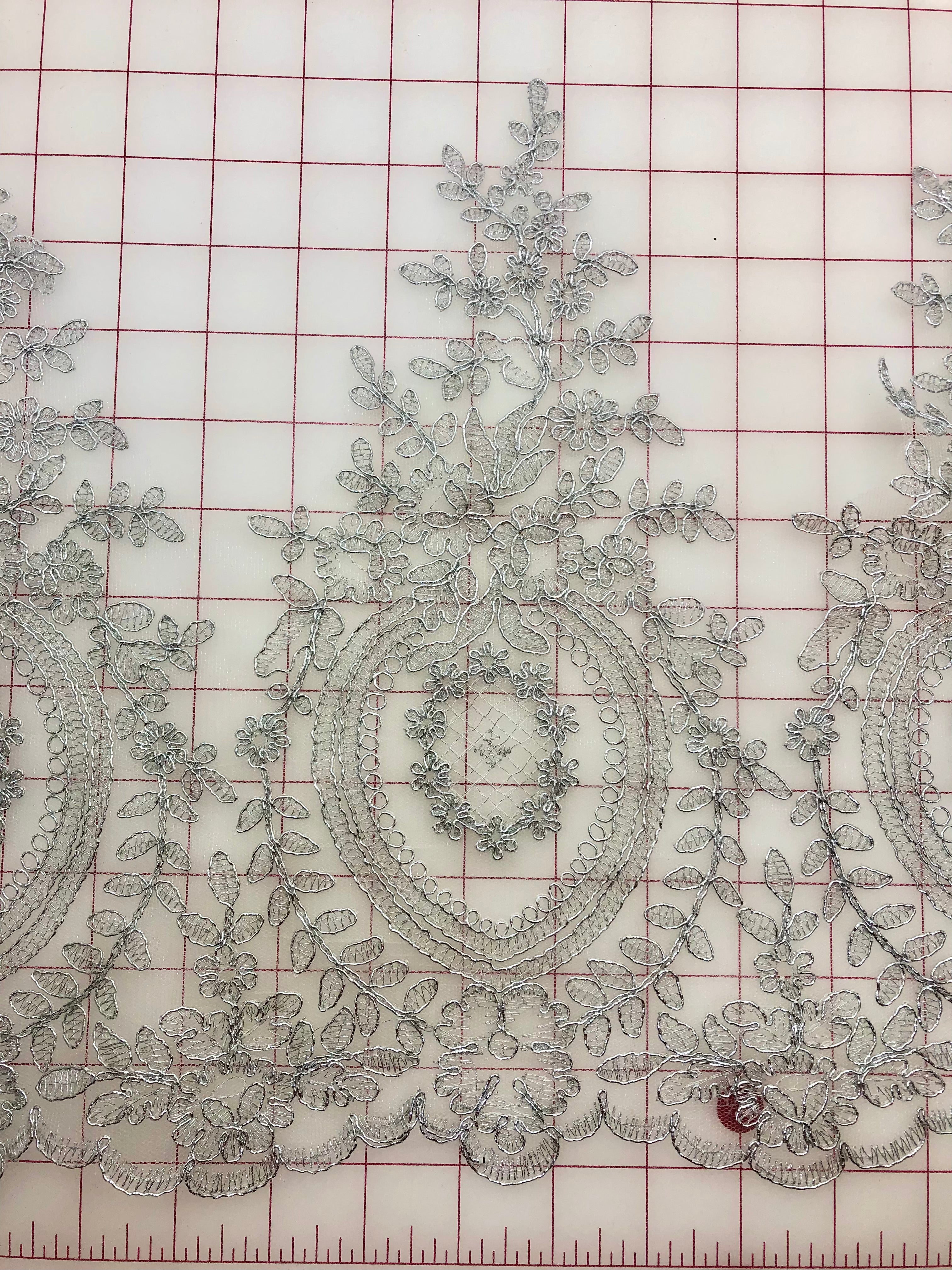 Priced per yard. Beautiful, lightweight, silver metallic corded lace motifs.